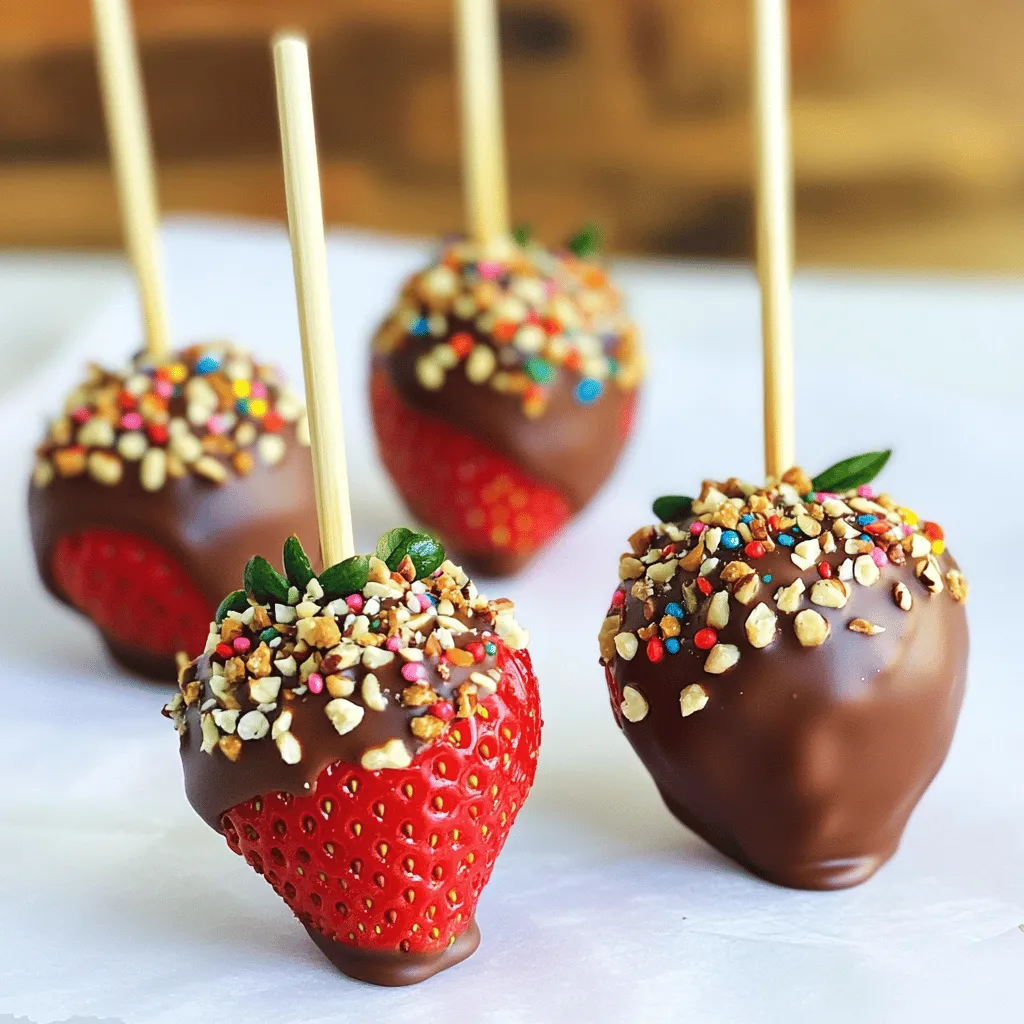 Get creative with toppings! Coconut flakes add a tropical flair. Mini chocolate chips bring extra sweetness and crunch. You can also use crushed nuts for a nutty bite. Rainbow sprinkles make the pops fun and colorful. Just make sure to add them right after dipping the strawberry.