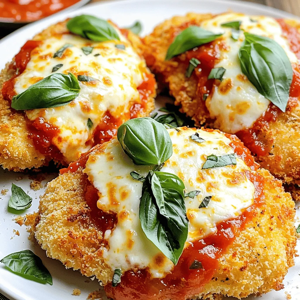 - 2 boneless, skinless chicken breasts - 1 cup breadcrumbs (preferably Italian seasoned) - 1/2 cup grated Parmesan cheese - 1 teaspoon garlic powder - 1 teaspoon onion powder - 1 teaspoon dried oregano - 1/2 teaspoon salt - 1/4 teaspoon black pepper - 1/2 cup marinara sauce - 1 cup shredded mozzarella cheese - Olive oil spray When making Air Fryer Chicken Parmesan, having the right ingredients matters. These items create a tasty and crispy dish. The chicken breasts need to be boneless and skinless for best results. The breadcrumbs give flavor, so use Italian seasoned ones if you can. - Fresh basil leaves for garnish - Extra marinara sauce for serving - Pasta or salad as a side These optional ingredients can elevate your meal. Fresh basil adds color and taste. Extra marinara sauce makes dipping fun. You can also serve it with pasta or a salad for balance. - Panko breadcrumbs for extra crunch - Kraft or Grana Padano Parmesan cheese for good flavor - Rao’s Homemade Marinara Sauce for rich taste Using quality brands can enhance your dish. Panko breadcrumbs are great for extra crunch. Kraft or Grana Padano offers a strong cheese flavor. Rao’s sauce is known for its fresh taste and quality. To start, take the chicken breasts and place them between two sheets of plastic wrap. Use a meat mallet or a rolling pin to pound the chicken. Aim for an even thickness of about 1/2 inch. This step helps the chicken cook evenly and stay juicy. Next, set up your breading station. In a shallow bowl, mix the breadcrumbs, Parmesan cheese, garlic powder, onion powder, oregano, salt, and black pepper. This mix adds a lot of flavor. Now, dip each chicken breast into the breadcrumb mixture. Press down firmly so the breadcrumbs stick well to both sides. Make sure each piece is well-coated for a crispy finish. Now it’s time to cook! Preheat your air fryer to 380°F (193°C) for about 5 minutes. Lightly spray the air fryer basket with olive oil spray. Place the breaded chicken breasts in a single layer in the basket. If you have more than two, you may need to cook them in batches. Lightly spray the tops of the chicken with olive oil spray before cooking. Air fry for 10 minutes, flipping halfway through to ensure even cooking. After 10 minutes, take out the basket and spoon marinara sauce over each chicken piece. Next, sprinkle shredded mozzarella cheese on top. Return the basket to the air fryer and cook for another 3-5 minutes. You want the cheese to be melty and bubbly. Finally, carefully remove the chicken from the air fryer. Let it rest for a couple of minutes before slicing. Enjoy your tasty meal! To make sure the chicken cooks evenly, pound it flat. Place the chicken breasts between two sheets of plastic wrap. Use a meat mallet or rolling pin to pound them to about 1/2 inch thick. This step helps avoid undercooked or dry spots. When you cook chicken that is uneven, some parts may overcook while others are raw. Even thickness is key for juicy, tender chicken. For perfect breaded chicken, use a shallow bowl. Mix breadcrumbs with Parmesan cheese, garlic powder, onion powder, oregano, salt, and pepper. This mix adds great flavor. Dip each chicken breast into the mix. Press firmly to ensure the breadcrumbs stick well. A good coat helps achieve that crispy crunch. If some bits fall off during cooking, don’t worry. You’ll still have a tasty meal! Serving your chicken well makes it look great. After cooking, let it rest for a couple of minutes. This keeps the juices inside. Place the chicken on a plate. Add fresh basil leaves on top for a pop of color. Serve with extra marinara sauce on the side for dipping. A side of pasta or salad pairs well, making your meal complete. Enjoy the beautiful presentation; it makes the meal more inviting! {{image_2}} You can switch up the cheese in this dish. Instead of mozzarella, try provolone or gouda. These cheeses melt well and add a unique taste. You can also mix cheeses for a richer flavor. Cheddar can give a nice twist too. Each cheese changes the dish’s style, making it fun to explore. To make this meal healthier, you can use whole wheat breadcrumbs. They add more fiber and nutrients. You can also try low-fat cheese or skip the cheese altogether for a lighter option. Instead of marinara, use a homemade tomato sauce with fresh herbs. This keeps the flavor while making it healthier. This dish shines with a side of pasta or a crisp salad. You can also serve it with roasted veggies for a balanced meal. For extra flavor, add fresh basil or parsley on top. A sprinkle of red pepper flakes can give it a nice kick. Pairing with garlic bread makes the meal even more delightful. To store leftover Air Fryer Chicken Parmesan, let the chicken cool to room temperature. Place it in an airtight container. This keeps the chicken fresh for up to three days. Be sure to separate the chicken from any sauce to prevent sogginess. When you are ready to enjoy the leftovers, preheat your air fryer to 350°F (175°C). Place the chicken in the air fryer basket. Heat for about 5-7 minutes until the chicken is hot. If you want the cheese melty again, cover it with foil for the first few minutes. You can freeze Air Fryer Chicken Parmesan, but it is best to do this without sauce. Wrap each piece in plastic wrap and place them in a freezer bag. Label the bag with the date. It will stay fresh for up to three months. When ready to eat, thaw in the fridge overnight and reheat in the air fryer. You can check if the chicken is done by using a meat thermometer. The chicken should reach an internal temperature of 165°F (74°C). If you do not have a thermometer, cut into the chicken. The meat should be white, with no pink inside. Yes, you can make this recipe gluten-free. Use gluten-free breadcrumbs instead of regular ones. Many brands offer tasty options that work well in this dish. Double-check the label to ensure they are truly gluten-free. Chicken Parmesan goes well with many sides. Here are some ideas: 