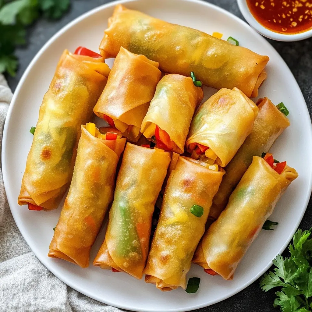 Once done, take the spring rolls out and let them cool for a minute. Serve them hot with sweet chili sauce or soy sauce for dipping. For a nice touch, garnish with fresh cilantro or sesame seeds. Enjoy your crispy veggie spring rolls!