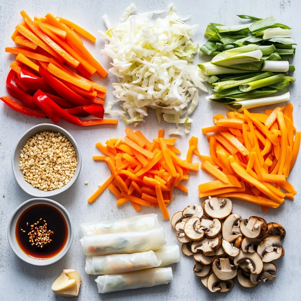 First, gather all your veggies. You need 1 cup of julienned carrots, 1 cup of thinly sliced bell peppers, and 1 cup of shredded green cabbage. Don’t forget 1/2 cup of finely chopped mushrooms and 2 chopped green onions. Finally, grab 2 cloves of minced garlic. Place all these in a large bowl. This mix adds color and crunch to your spring rolls.