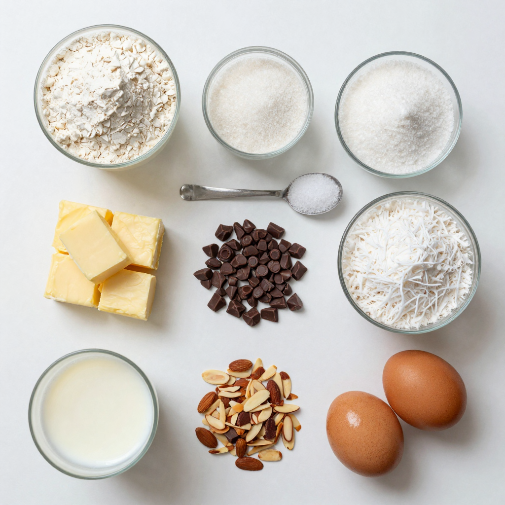 - Stir in the shredded coconut, chocolate chips, and almond slivers, ensuring they are evenly distributed throughout the mixture.