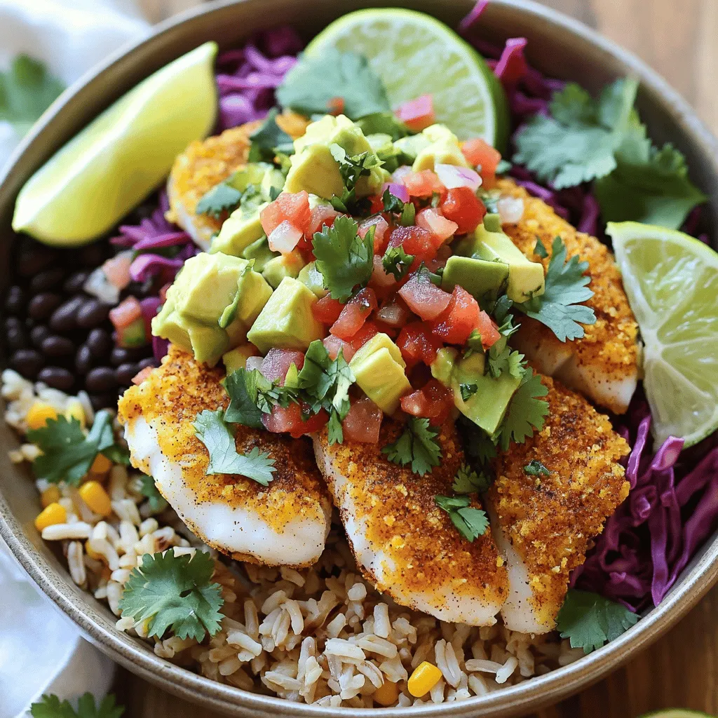To boost flavor, try adding lime juice to your fish before cooking. This gives a fresh zing. You can also mix lime zest into your cornmeal for added depth. For extra crunch, top your bowls with crispy tortilla strips. If you love heat, add sliced jalapeños or a hot sauce drizzle. Consider mixing fresh herbs, like cilantro, into the pico de gallo. This adds freshness and brightness. These simple tweaks can elevate your dish to a new level.