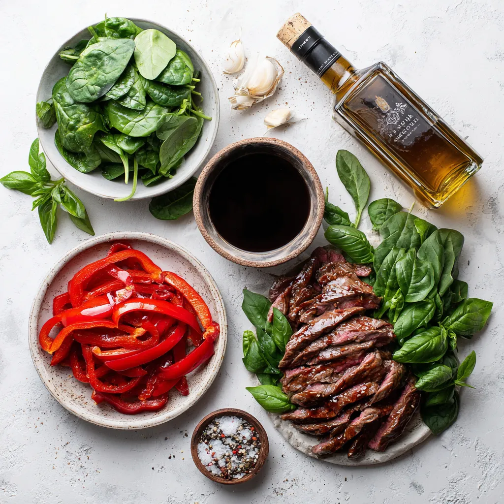 To make these balsamic glazed steak rolls, gather all your ingredients first. Flank steak is a great choice for this recipe. It has a nice flavor and becomes tender when cooked right. Baby spinach adds a fresh crunch. Roasted red peppers give a sweet touch.