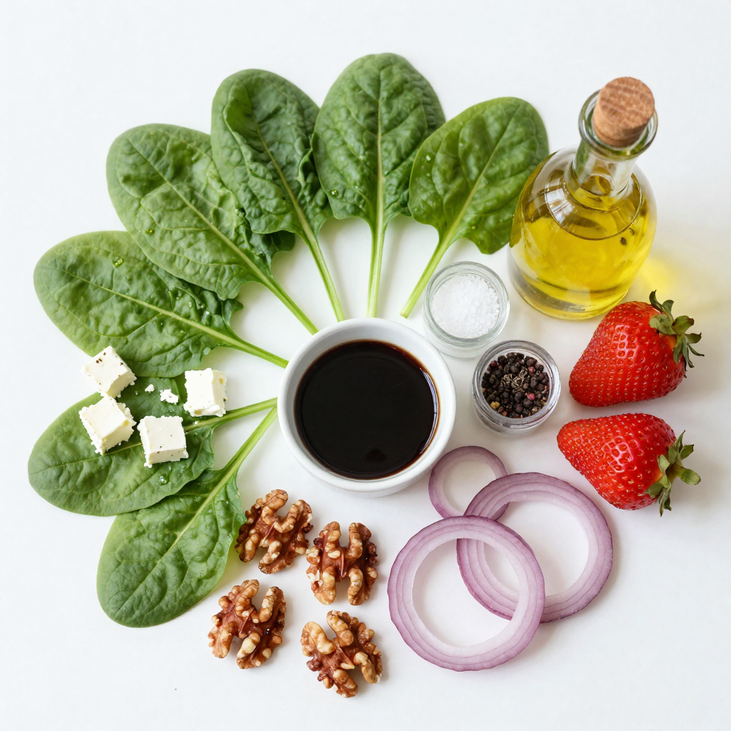 The fresh produce is the heart of this salad. Baby spinach adds a soft, leafy base. It is packed with vitamins. Strawberries bring sweetness and a lovely red color. Their juicy texture contrasts nicely with the spinach. The red onion adds a sharp bite. This gives the salad depth and flavor. Together, these ingredients create a colorful and healthy mix.