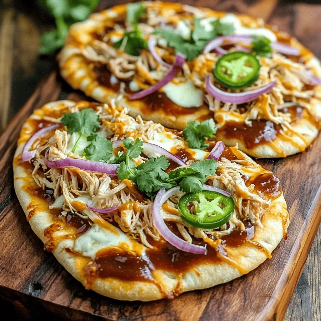 ![- 2 large flatbreads (store-bought or homemade) - 1 cup cooked chicken breast, shredded - 1/2 cup BBQ sauce (your favorite brand) - 1 cup shredded mozzarella cheese - 1/2 red onion, thinly sliced - 1/4 cup fresh cilantro, chopped - 1/4 cup sliced jalapeños (optional for heat) - 1 tablespoon olive oil - Salt and pepper to taste It’s fun to create BBQ Chicken Flatbread Pizza with these simple ingredients. You can use store-bought flatbreads or make your own. I often choose the store-bought ones for quick meals. Shredded chicken is key. You can use leftover rotisserie chicken or cook it fresh. The BBQ sauce brings a sweet and tangy flavor. I love using my favorite brand, but feel free to explore. Mozzarella cheese adds creaminess and helps everything stick together. Red onion gives a nice crunch and flavor. Cilantro adds freshness, while jalapeños can bring some heat. I like to keep them optional because not everyone enjoys spicy food. Olive oil makes the flatbreads crispy and golden. Finally, remember to season with salt and pepper to enhance the flavors. - Calories per serving: Approximately 300-350 - Macronutrients: - Protein: 25g - Carbohydrates: 30g - Fats: 12g This dish is not only tasty but also filling. Each serving gives you a good amount of protein. The carbs come mainly from the flatbreads. The fats are from the cheese and olive oil. Enjoy this delightful meal while knowing it's also packed with nutrients. For the complete cooking steps, check the Full Recipe. 1. Start by preheating your oven to 450°F (230°C). This high heat will help create a crispy pizza base. 2. In a mixing bowl, combine 1 cup of shredded chicken with 1/4 cup of your favorite BBQ sauce. Mix well until the chicken is fully coated. This adds flavor and keeps the chicken moist. 1. Place the flatbreads on a baking sheet lined with parchment paper. This prevents sticking and makes cleanup easy. 2. Brush each flatbread lightly with 1 tablespoon of olive oil. This helps achieve a nice, crispy texture. 3. Spread the remaining BBQ sauce (about 1/4 cup) evenly over the flatbreads. Leave a small border around the edges for a perfect crust. 4. Evenly distribute the BBQ chicken mixture on top of the sauce on each flatbread. Make sure to cover it well for great flavor. 5. Sprinkle 1 cup of shredded mozzarella cheese generously on top of the chicken. This will melt into a gooey layer as it bakes. 6. Add sliced red onions and jalapeños (if using) on top for added crunch and heat. 1. Bake in the preheated oven for about 12-15 minutes. Watch closely until the cheese is melted and bubbly, and the edges of the flatbreads turn golden brown. 2. Once baked, remove the flatbreads from the oven. Let them cool for a couple of minutes before slicing. 3. Before serving, garnish with 1/4 cup of fresh chopped cilantro. This adds a pop of color and fresh flavor. Now, you're ready to enjoy your BBQ Chicken Flatbread Pizza! For the complete recipe, check the [Full Recipe]. To get crispy flatbreads, brush them lightly with olive oil. This helps create a nice crunch. Bake them at a high temperature, around 450°F (230°C), for the best results. For BBQ sauce, I recommend brands like Sweet Baby Ray's or Stubbs. These sauces add great flavor and a touch of sweetness. You can also make your own sauce for a personal touch. One common mistake is overloading the flatbreads with toppings. Too many toppings can make the flatbread soggy. Stick to a few key ingredients for the best taste and texture. Another mistake is not preheating the oven. Always preheat to ensure even cooking. If the oven is not hot enough, the flatbread won’t bake well. To pair with BBQ Chicken Flatbread Pizza, consider serving a fresh salad. A crunchy coleslaw or a Caesar salad works well. You can also try fresh veggies and dip for a side. For drinks, iced tea or lemonade can be refreshing. If you want something stronger, pair it with a light beer. These drinks complement the flavors nicely. For more details, check out the Full Recipe to make this dish at home! {{image_2}} You can switch up your BBQ chicken flatbread pizza with fun toppings. For a vegan option, use shredded jackfruit instead of chicken. It mimics the texture well. For cheese, try vegan mozzarella or cashew cheese. Both melt nicely and add flavor. You can also play with sauces. Instead of BBQ, drizzle ranch dressing for a creamy touch. Hot sauce brings heat if you love spice. Both options can change the feel of your pizza. Making your own flatbread can be easy and fun. Mix flour, water, salt, and olive oil for a simple dough. Roll it out, then cook it on a skillet until golden. This gives you a fresh base. If you need gluten-free options, use almond flour or chickpea flour. You can also find gluten-free flatbreads at many stores. They work just as well for this recipe. Add a twist of flavor by including fruits. Pineapple adds sweetness and pairs well with BBQ. Apples can bring a crisp bite, too. Slice them thin and scatter them on top. For an international flair, think beyond the usual. Try adding some Indian spices for a curry twist. You can also use Mexican flavors like black beans and corn. Don't be afraid to get creative! These variations keep your BBQ chicken flatbread pizza fresh and exciting. For the complete recipe, check out the Full Recipe. To keep your BBQ chicken flatbread pizza fresh, use these simple tips: - Refrigeration: Place leftover pizza in an airtight container. You can also wrap it tightly in plastic wrap or aluminum foil. This helps keep the moisture in and the pizza fresh for up to three days. - Freezing: For longer storage, freeze the flatbread pizza. Wrap each piece in plastic wrap, then place it in a freezer bag. Squeeze out as much air as possible. It will stay good for up to three months. Reheating flatbread pizza can be tricky, but I have some great methods to keep it tasty: - Best Practices: Preheat your oven to 350°F (175°C). Place the pizza on a baking sheet. Heat for a