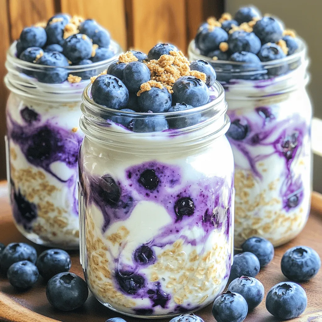 ![- 1 cup rolled oats - 1 cup almond milk (or your preferred milk) - 1/2 cup plain Greek yogurt - 1/4 cup cream cheese, softened - 2 tablespoons maple syrup (or honey) - 1 teaspoon vanilla extract - 1/2 cup fresh blueberries - 1 tablespoon chia seeds (optional) - 1/4 teaspoon ground cinnamon - Fresh blueberries and graham cracker crumbs for topping - If you want dairy-free options, swap cream cheese and Greek yogurt for coconut yogurt. Almond milk works well, but you can also use oat or soy milk. - For gluten-free oats, use certified gluten-free rolled oats. They are easy to find in most stores. - If you prefer a different sweetener, try agave syrup or coconut sugar instead of maple syrup or honey. When I create this dish, I aim for the best taste and texture. These ingredients blend well, giving you that cheesecake flavor you crave. The oats soak up the almond milk and yogurt, creating a creamy base. The blueberries add a burst of natural sweetness and freshness. Plus, the graham cracker crumbs on top provide a nice crunch. You can find the full recipe here, which shows you how to mix everything perfectly. 1. In a medium bowl, combine the rolled oats, almond milk, Greek yogurt, and cream cheese. 2. Whisk these ingredients together until they form a creamy mixture. 3. Next, stir in the maple syrup, vanilla extract, chia seeds, and ground cinnamon. 4. Mix until all the flavors blend smoothly. 5. Now, gently fold in the fresh blueberries. 6. Be careful not to crush the blueberries while mixing. 1. Divide the mixture evenly into two mason jars or airtight containers. 2. Close the jars with their lids tightly. 3. Place the jars in the fridge overnight. 4. This helps the oats soak up the flavors and get soft. 1. When it's time to serve, remove the jars from the fridge. 2. Give each jar a good stir to mix everything up again. 3. For a cheesecake effect, top your oats with more fresh blueberries. 4. Sprinkle graham cracker crumbs on top to finish it off. For the full recipe, you can refer to the recipe section above. To get the best texture, use rolled oats. They soak up the liquid without getting mushy. You want your oats creamy but still holding their shape. Avoid quick oats; they can turn your dish into a mushy mess. For a thicker texture, add a bit more oats or reduce the milk slightly. Spices can take your oats to the next level. A pinch of nutmeg or a dash of vanilla can make a big difference. You can also add fresh lemon zest for a bright flavor. Don't forget about crunch! Toss in some chopped nuts or seeds. They add a nice texture and extra nutrition. Making a larger batch saves time. Double or triple the recipe and store in jars. This way, you can grab a jar for breakfast all week. These oats keep well in the fridge for up to five days. Use airtight containers to keep them fresh. Enjoy a quick and easy meal every morning! For the full recipe, check the earlier section. {{image_2}} You can swap blueberries for other fruits. Strawberries, raspberries, or blackberries work great, too. Each fruit brings its own sweet flavor. You can also use seasonal fruits. In summer, try peaches or cherries. In fall, apple slices or pumpkin puree can add a fun twist. Want to make your oats even better? You can add protein powders or nut butters. These add a great taste and extra protein. Almond butter or peanut butter mix well. Seeds like chia or flax can add crunch and fiber. They also help keep you full longer. Feeling fancy? You can create fun dessert flavors. Try adding cocoa powder for chocolate oats. You can also use caramel syrup for a sweet treat. Using flavored yogurt can make it even tastier. Vanilla or strawberry yogurt adds a nice twist. You can explore so many flavors with just a few tweaks! Check the [Full Recipe] for all the details you need. To keep your blueberry cheesecake overnight oats fresh, use glass jars or airtight containers. These options seal well and prevent odors from mixing in the fridge. Make sure to store them in the refrigerator. This keeps the oats cool and safe to eat. For the best taste and texture, eat your oats within three days. After this, the oats may lose their creamy texture. Signs of spoilage include a sour smell, watery separation, or mold. If you see any of these, throw them away. Yes, you can freeze overnight oats! This is great for meal prep. Just make sure to use freezer-safe containers. When you’re ready to eat, transfer the oats to the fridge to thaw overnight. Avoid heating them directly from the freezer. This can change the texture and flavor. Blueberry Cheesecake Overnight Oats stay fresh for about 3 to 5 days in the fridge. Store them in airtight containers. This keeps them moist and tasty. If you notice any strange smell or mold, it's best to toss them out. Yes, you can use frozen blueberries. However, they may change the texture a bit. Frozen berries can make the oats a little mushy. If you want to keep the fresh taste, add frozen blueberries just before serving. Almond milk is my go-to for these oats. It adds a nice flavor without extra calories. You can also use oat milk, soy milk, or regular cow's milk. Choose what you like best. Each type gives a different taste and creaminess. To make this recipe vegan, swap Greek yogurt for coconut yogurt. Use vegan cream cheese instead of regular cream cheese. For sweeteners, choose maple syrup or agave nectar. These simple swaps keep it dairy-free and delicious. Yes, you can meal prep these oats for the week. Just make sure to portion them in jars. They keep well in the fridge. This is a great way to have a quick and healthy breakfast ready. Just grab a jar each morning! For the full recipe, check out the provided link. This article covered how to make Blueberry Cheesecake Overnight Oats. We went over key ingredients, easy steps, and various storage tips. You learned how to customize your oats and enjoy delicious flavors. Whether you need a quick breakfast or snack, these oats fit the bill. Enjoy the crea