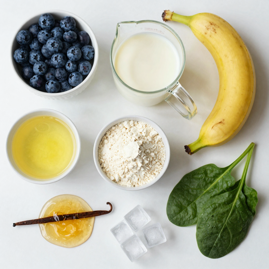 Start by measuring your fresh ingredients. Use a cup for the blueberries. If you have frozen blueberries, that works too. Next, grab a medium banana. Peel it and break it into chunks. For the almond milk, one cup is the right amount. If you prefer another milk, feel free to swap it out. Squeeze the lemon for one tablespoon of juice. If you want extra sweetness, get your honey or maple syrup ready. Finally, if you want to add greens, wash a handful of spinach or kale.