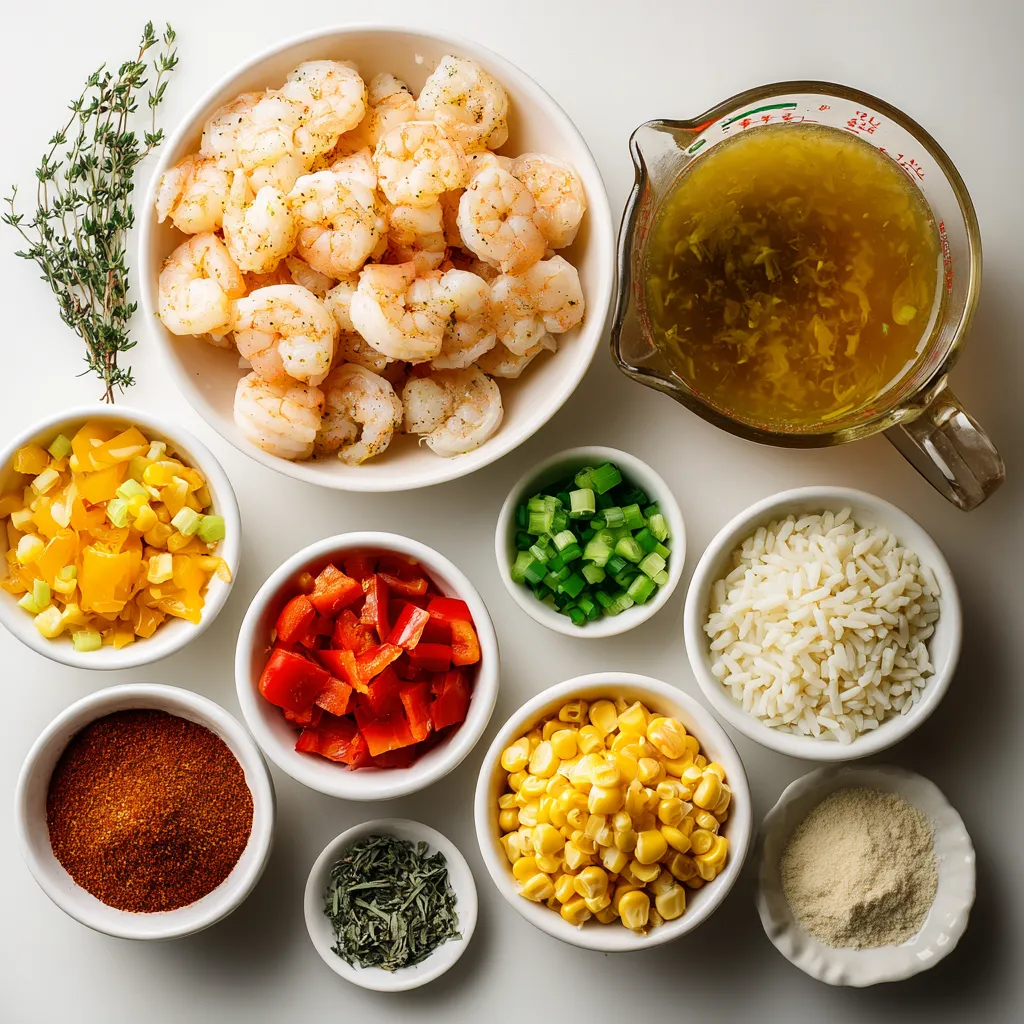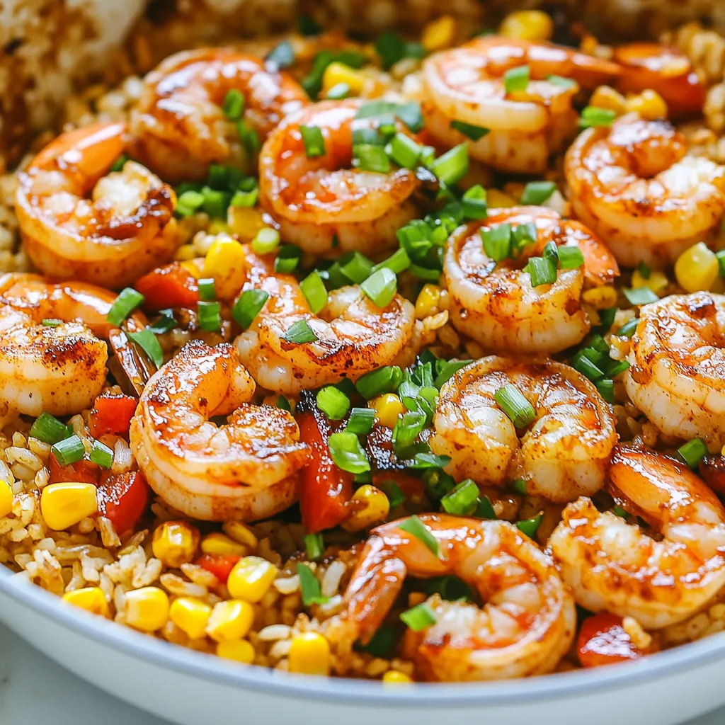 - Once the rice is done, gently fold in the sautéed shrimp and corn until well combined. Cook for another 2-3 minutes to heat everything through.