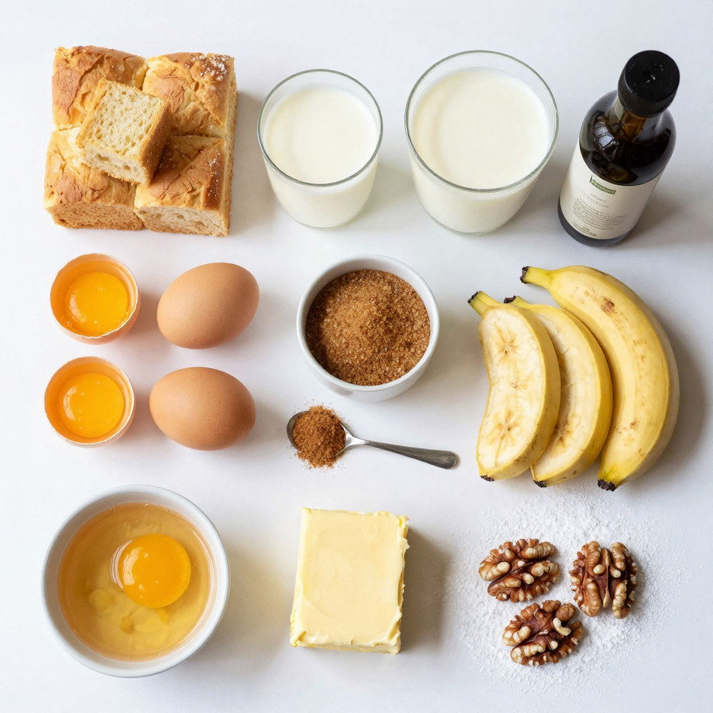 The first step is to gather all your main ingredients. The bread is key. Challah or brioche adds a soft, rich texture. You can use whole or almond milk for a twist. Eggs and heavy cream create a creamy custard. Brown sugar, vanilla, and cinnamon give it sweetness and warmth. Bananas add a delightful fruity layer.