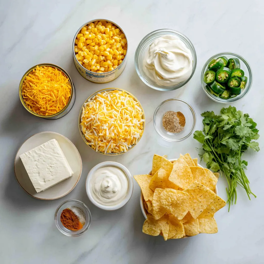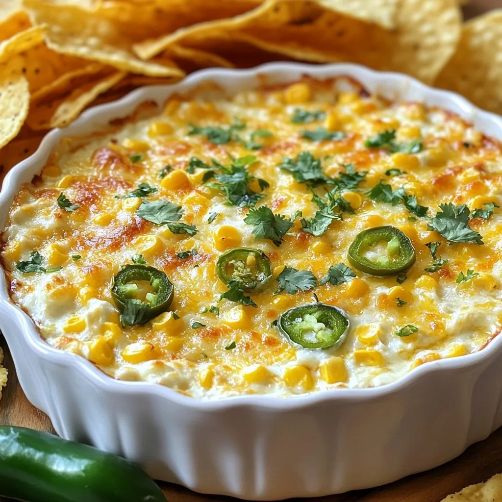 - 1 can (15 oz) corn kernels, drained: This gives your dip a sweet crunch. Fresh corn can be great, too, if you have it. - 1 can (4 oz) diced jalapeños, drained: Adjust this for your spice level. More jalapeños mean more heat! - 1 cup cream cheese, softened: Creamy and rich, this is the base of your dip. - 1 cup shredded cheddar cheese: Cheddar adds a bold flavor that melts beautifully. - 1/2 cup sour cream: This adds tang and creaminess to balance the heat. - 1/4 cup mayonnaise: This keeps the dip smooth and adds richness. - 1/2 teaspoon garlic powder: Garlic enhances the dip's flavor without being too strong. - 1/2 teaspoon onion powder: This adds depth and a bit of sweetness. - 1/4 teaspoon cayenne pepper (optional): Use this for an extra kick if you like heat. - Salt and pepper to taste: These are key for bringing all the flavors together. - Fresh cilantro, chopped (for garnish): This adds a fresh touch when serving. - Tortilla chips, for serving: Perfect for dipping into this cheesy goodness. Using fresh ingredients can elevate your dish. Fresh corn offers more sweetness than canned. Fresh jalapeños provide a sharper heat that canned versions lack. When you can, opt for fresh. - Chopped green onions: These can add a nice crunch and fresh flavor on top. - Crumbled feta cheese: This can give a tangy twist to the dip. - Sliced olives: They add a briny flavor and nice texture. - Spice level adjustments: If you want less heat, use fewer jalapeños or remove the seeds. For more heat, add more diced jalapeños or include cayenne pepper. Adjusting these ingredients helps you create the perfect dip for your taste! {{ingredient_image_1}} To start, preheat your oven to 350°F (175°C). This step is key for even baking. While the oven heats up, grab a large mixing bowl. In this bowl, combine the softened cream cheese, sour cream, and mayonnaise. Mix these ingredients well until you see a smooth texture. A smooth mix helps the dip bake evenly. Next, add the corn kernels and diced jalapeños. Stir in the shredded cheddar cheese, garlic powder, onion powder, and cayenne pepper if you like some heat. Remember to season with salt and pepper to taste. Mix everything until it looks well combined. Now, it's time to transfer the dip to a 9x9-inch baking dish. Spread the mixture out evenly in the dish. This helps it cook through without any parts staying cold. Place the dish in the preheated oven. Bake for 25-30 minutes. You’ll know it’s ready when the dip is bubbly and the top is slightly golden. Once it’s done, carefully remove it from the oven. Let it cool for a few minutes before serving. Garnish with chopped fresh cilantro for a pop of color and flavor. Enjoy it warm with tortilla chips for a tasty treat! To make your Cheesy Jalapeño Corn Dip even better, consider adding herbs or spices. Fresh cilantro adds a bright taste. You can also try fresh chives or parsley for extra flavor. If you want to change the heat level, adjust the jalapeños. Use less for a milder dip or add more for a spicier kick. Cayenne pepper also works well. Start with a little, then taste and add more if you like heat. When serving, warm tortilla chips are best. They are crunchy and hold the dip well. You can also use veggie sticks like carrots or celery for a fresh touch. For sides, think of guacamole or salsa. They pair well with the dip and add more flavor. Cold drinks like lemonade or iced tea help balance the heat from the jalapeños. Enjoy your dip at parties or gatherings! Pro Tips Adjust the Heat: If you prefer a milder dip, reduce the amount of diced jalapeños or use mild green chilies instead. For a Creamier Texture: Mix in an extra 1/4 cup of sour cream for a smoother consistency. Make Ahead: Prepare the dip a day in advance and refrigerate. Just bake it when you're ready to serve! Garnish for Freshness: Adding lime juice to the cilantro garnish can elevate the flavor and add a refreshing twist. {{image_2}} You can easily swap cheeses for new flavors. For a creamier dip, try goat cheese or feta. These cheeses add a tangy twist that pairs well with the corn. For a lighter option, substitute low-fat cream cheese and sour cream. This keeps the dip rich without the added calories. If you want a vegetarian version, skip the mayonnaise and use Greek yogurt instead. It adds a nice creaminess and tang. For gluten-free needs, check all labels to ensure your chips are safe. Most tortilla chips are gluten-free, but it's good to double-check. Adding more veggies can make this dip even better. Try mixing in diced bell peppers or spinach for extra color and nutrition. You can also add black beans for protein. For a twist inspired by Mexican food, mix in some taco seasoning. It gives a whole new flavor that can excite your taste buds. If you love seafood, add some cooked shrimp or crab for a coastal twist. This pairs beautifully with the creamy base of the dip. Use these ideas to make the dip your own. Each variation can create a unique flavor experience. To keep your Cheesy Jalapeño Corn Dip fresh, store it properly. First, let the dip cool down to room temperature. Then, transfer it to an airtight container. This will help keep moisture in and prevent odors from other foods. If you want to freeze the dip, use a freezer-safe container. Make sure to leave some space at the top, as the dip may expand when frozen. You can also wrap the container in plastic wrap for extra protection. When it’s time to reheat, do so slowly. You can use the oven or microwave. If using the oven, preheat it to 350°F (175°C). Place the dip in an oven-safe dish and heat for about 15-20 minutes. Stir halfway through for even warmth. If using a microwave, heat in bursts of 30 seconds, stirring in between until hot. In the fridge, your dip will stay fresh for about 3-5 days. Be sure to check for signs of spoilage. If you see mold or a change in color, it’s best to toss it. In the freezer, the dip can last up to 2-3 months. When thawing, move 