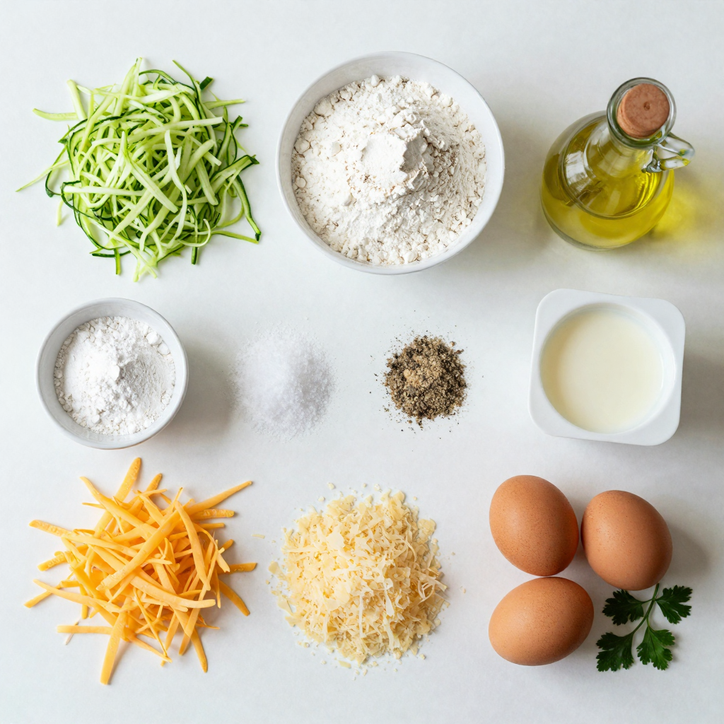 Gather these ingredients before you start. The zucchinis give the muffins moisture and a nice texture. Using fresh zucchini makes a big difference. Grating them is simple and fun. You will also need flour, baking powder, and baking soda for the right rise. Add salt, garlic powder, and black pepper for flavor.