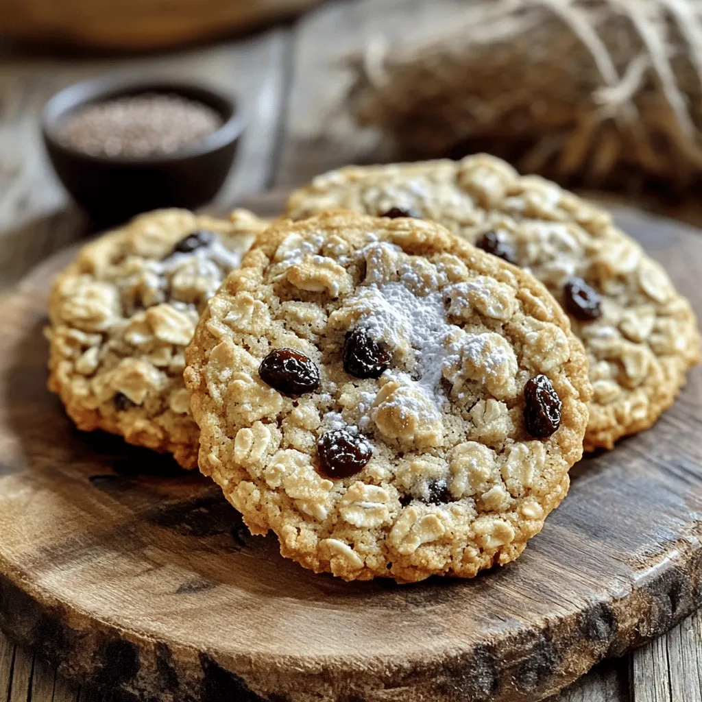 ![To make chewy oatmeal raisin cookies, you need key ingredients. Here is what you should have: - 1 cup all-purpose flour - 1 teaspoon baking soda - 1 teaspoon cinnamon - 1/2 teaspoon salt - 1/2 cup unsalted butter, softened - 3/4 cup brown sugar, packed - 1/4 cup granulated sugar - 1 large egg - 1 teaspoon vanilla extract - 1 1/2 cups old-fashioned oats - 1 cup raisins These ingredients work together to create that soft and chewy texture. The oats give the cookies a hearty feel, while the raisins add natural sweetness. You can make your cookies even better with some optional add-ins. Here are a few ideas: - 1/2 cup chopped walnuts - 1/2 cup chocolate chips - 1/2 cup shredded coconut Feel free to mix and match these extras. Each add-in brings its own tasty twist. The walnuts add crunch, while chocolate chips can make them extra special. Choosing the right ingredients matters a lot. Here are some tips: - Butter: Use unsalted butter for better control over saltiness. - Oats: Choose old-fashioned oats for the best texture. - Raisins: Look for fresh, plump raisins; they should not be dry or hard. Fresh ingredients lead to better cookies. Always check expiration dates. For the full recipe, see the recipe section above. To start, gather all your ingredients. You will need flour, baking soda, cinnamon, salt, butter, brown sugar, granulated sugar, an egg, vanilla, oats, raisins, and optional walnuts. 1. Preheat your oven to 350°F (175°C). Line a baking sheet with parchment paper. 2. In a medium bowl, whisk the flour, baking soda, cinnamon, and salt. Set this aside. 3. In a large bowl, cream together the softened butter, brown sugar, and granulated sugar. Mix until it’s light and fluffy. 4. Beat in the egg and vanilla extract until everything is well combined. 5. Gradually mix the dry ingredients into the wet mixture. Stir until just combined. 6. Lastly, fold in the oats, raisins, and walnuts (if you’re using them). Now it’s time to bake! 1. Use a spoon to drop rounded tablespoons of dough onto your prepared baking sheet. Leave about 2 inches between each mound. 2. Bake in your preheated oven for 10-12 minutes. Look for golden edges, but keep the centers soft. Once baked, let the cookies cool. 1. Allow them to sit on the baking sheet for 5 minutes. This helps them set. 2. Carefully transfer the cookies to a wire rack to cool completely. 3. If you want to store them, keep them in an airtight container. They stay fresh for several days. For the full recipe, visit the recipe section above. Enjoy your chewy oatmeal raisin cookies! To get that perfect chewy texture in your cookies, use old-fashioned oats. They soak up moisture well, keeping your cookies soft. Also, do not overmix the dough. Just mix until the dry ingredients blend in. This keeps your cookies tender. Lastly, take them out of the oven while they still look a bit soft. They will firm up as they cool. One common mistake is using quick-cooking oats instead of old-fashioned oats. Quick oats can make your cookies dry. Another mistake is baking them too long. Watch the edges; they should be golden, but the center must stay soft. Lastly, make sure your butter is softened, not melted. Melted butter can change your cookie’s texture. For a lovely presentation, place the cookies on a nice platter. Dust them lightly with powdered sugar for a sweet touch. You can also serve them with a bowl of fresh fruit. Adding a side of flaxseeds or sunflower seeds gives a nice crunch. These ideas make your cookies not just tasty but also pretty! For the full recipe, check back to ensure you have all the steps. {{image_2}} You can make your cookies healthier. Use whole wheat flour instead of all-purpose flour. This adds fiber and nutrients. You can also swap in coconut oil for butter. This change gives a nice flavor and is a great fat source. For sweetness, try using honey or maple syrup instead of sugar. This can cut down on refined sugars and add a unique taste. Get creative with flavors! Add dark chocolate chips for a richer taste. You can also mix in dried cranberries or apricots for a fruity twist. Try spices like nutmeg or ginger to add warmth. Even a splash of orange juice can brighten the cookies. These fun changes keep the recipe exciting and fresh! If you need gluten-free cookies, use almond flour or a gluten-free flour blend. Make sure your oats are labeled gluten-free. For vegan cookies, skip the egg and use flaxseed meal. Mix one tablespoon of flaxseed with three tablespoons of water and let it sit for a few minutes. This makes a great egg substitute. These options let everyone enjoy chewy oatmeal raisin cookies! For the full recipe, check out the details above. To keep your chewy oatmeal raisin cookies fresh, store them in an airtight container. You can place a piece of bread in the container to help keep them soft. The bread will absorb extra moisture, ensuring your cookies remain chewy. You can freeze the cookies if you want to save some for later. First, let the cookies cool completely. Then, place them in a single layer on a baking sheet. Freeze them for about an hour. Once they are firm, transfer them to a freezer bag or container. This way, you can enjoy them anytime! Stored cookies stay fresh for about one week at room temperature. In the freezer, they can last up to three months. When you are ready to eat frozen cookies, let them thaw at room temperature for a few minutes. For a warm treat, heat them in the oven for a few minutes. Don’t forget to check the [Full Recipe] for more tips! Your oatmeal raisin cookies may not be chewy for a few reasons. First, check your oven temperature. If it is too hot, the cookies may bake too fast and dry out. Second, over-mixing the dough can lead to tough cookies. Mix only until the ingredients combine. Lastly, using too much flour can also make them dry. Always measure flour correctly. Yes, you can substitute some ingredients in the recipe. If you do not have brown sugar, use white sugar instea