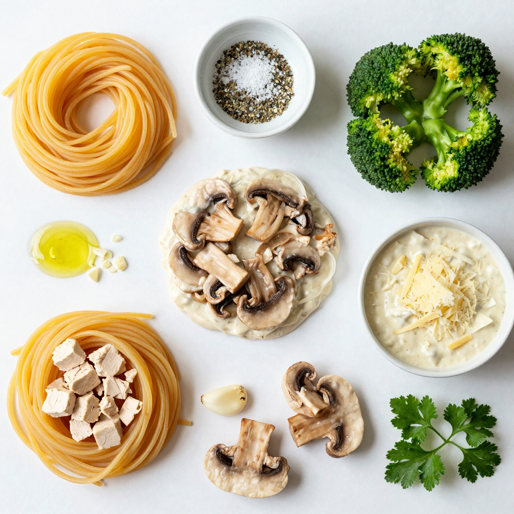 Start by gathering your ingredients. You need cooked pasta, chicken, mushrooms, broccoli, and sauce. Also, have mozzarella and Parmesan cheese ready. Dice the chicken and slice the mushrooms. This helps the cooking go fast. Mince the garlic too. Don’t forget to measure out the olive oil and seasonings.