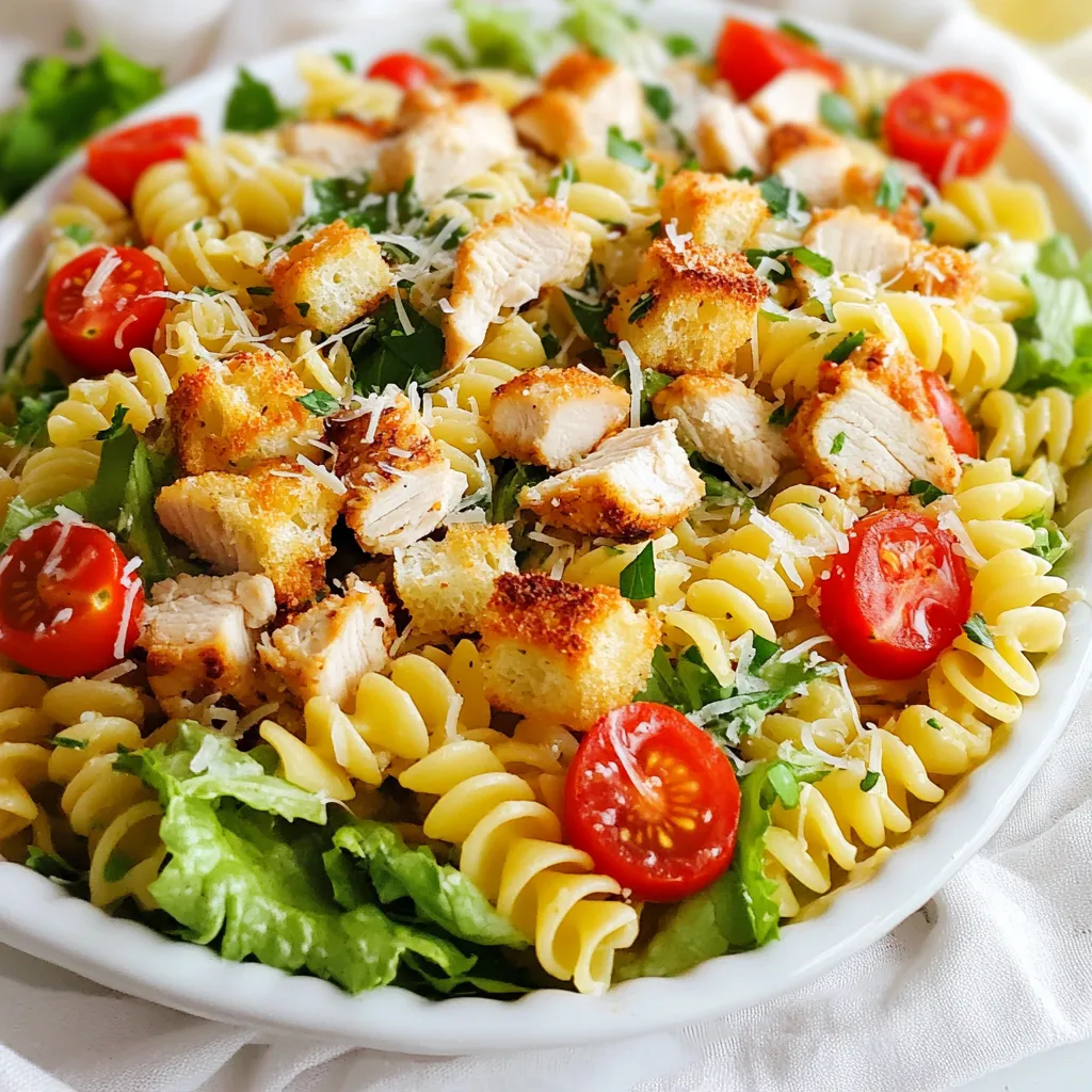 - 2 cups rotini pasta - 1 cup cooked chicken breast, diced - 1 cup romaine lettuce, chopped - ½ cup cherry tomatoes, halved - ¼ cup grated Parmesan cheese - ½ cup Caesar dressing - ¼ teaspoon garlic powder - Salt and pepper to taste - ¼ cup croutons for garnish - Fresh parsley, chopped (for garnish) - Large pot - Mixing bowl - Small bowl - Spoon for mixing To make the Chicken Caesar Pasta Salad, you need fresh and simple ingredients. Start with rotini pasta; it holds dressing well and adds a fun twist. Cooked chicken breast adds protein and makes it filling. Fresh romaine lettuce gives the salad crunch. Cherry tomatoes add color and sweetness. Grated Parmesan cheese brings in a salty richness. Finally, Caesar dressing ties everything together with its creamy flavor. For seasoning, use garlic powder to enhance the taste. Add salt and pepper to your liking. Croutons give a nice crunch on top, while chopped parsley adds freshness and a pop of color. Make sure you have a large pot for boiling pasta. A mixing bowl helps combine the salad. Use a small bowl to mix the dressing and seasonings. A spoon is handy for mixing everything. With these ingredients and tools, you’re ready to create a delightful Chicken Caesar Pasta Salad! {{ingredient_image_1}} To make Chicken Caesar Pasta Salad, start by boiling rotini pasta. - Bring a large pot of salted water to a boil. - Add 2 cups of rotini pasta. - Cook until al dente, about 8 to 10 minutes. - Drain the pasta and rinse it under cold water to cool. Next, prepare the salad by combining all the main ingredients. - In a large mixing bowl, add the cooked pasta. - Add 1 cup of diced cooked chicken breast. - Then, toss in 1 cup of chopped romaine lettuce and ½ cup of halved cherry tomatoes. - In a small bowl, mix ½ cup of Caesar dressing with ¼ teaspoon of garlic powder, salt, and pepper. - Adjust the seasoning to your taste. Now, it’s time to assemble everything. - Drizzle the dressing over the salad mixture. - Gently toss everything together until well combined. - Sprinkle ¼ cup of grated Parmesan cheese on top and fold it into the salad. - Serve immediately, garnished with ¼ cup of croutons and fresh chopped parsley. This simple process helps you create a tasty Chicken Caesar Pasta Salad that everyone will enjoy! When you boil the rotini pasta, add salt to the water. This enhances the flavor of the pasta. A good rule is to use about one tablespoon of salt for every 4 quarts of water. This small step makes a big difference. You want your pasta to be al dente. This means it should be firm, not mushy. Follow the cooking time on the package, but start checking a minute early. After draining, rinse the pasta under cold water. This stops the cooking process and cools it down quickly. You can buy Caesar dressing at the store or make your own. For a quick homemade version, mix mayonnaise, lemon juice, garlic, and Parmesan. Taste it and adjust to your liking. You might want to add more garlic or lemon for a stronger flavor. If you prefer a lighter salad, use less dressing. You can always add more later. Remember, it’s easier to add than to take away. Serving your Chicken Caesar Pasta Salad in a large bowl looks great. Top it with extra Parmesan and bright parsley. This makes your dish pop with color. For a fun twist, serve the salad in jars. This is perfect for picnics or gatherings. Each jar can hold a single serving, making it easy for everyone to grab one. Just layer the ingredients for a beautiful look. Pro Tips Cook Pasta Al Dente: Cooking the rotini until al dente ensures that it maintains a slight firmness and doesn't become mushy when mixed with the dressing. Chill the Ingredients: For an even more refreshing salad, chill the chicken, pasta, and vegetables before mixing. This enhances the overall taste and texture. Customize Your Greens: Feel free to add other greens such as spinach or arugula to enhance the nutritional value and flavor of your salad. Add Extra Crunch: Incorporate some toasted nuts or seeds, like pine nuts or sunflower seeds, for an unexpected crunch and added nutritional benefits. {{image_2}} You can easily make this salad vegetarian. Just swap the chicken for grilled tofu or chickpeas. Both options add great protein. Tofu gives a nice texture, while chickpeas add a nutty flavor. For dressings, try a creamy avocado dressing or a simple lemon vinaigrette. These choices keep the salad fresh and tasty. If you're gluten-free, use gluten-free pasta. Many brands offer great alternatives made from rice or corn. You can also add proteins like grilled shrimp or diced turkey. These options keep your meal balanced and flavorful while sticking to your diet. Want to jazz up your Chicken Caesar Pasta Salad? Add extra veggies like cucumbers or bell peppers. They bring crunch and freshness. For a protein boost, consider adding crispy bacon or succulent shrimp. These additions make the dish even more exciting and customizable for your taste. To store leftovers, place the Chicken Caesar Pasta Salad in an airtight container. This keeps it fresh and safe. The salad lasts about 3 days in the fridge. However, the texture may change a bit over time. You can eat the salad cold or warm it up. To reheat, use the microwave for a minute or two. Stir it well to avoid hot spots. If you want to refresh the salad, add a bit more Caesar dressing after heating. This helps restore some flavor and moisture. You can freeze Chicken Caesar Pasta Salad, but it may not taste the same. If you decide to freeze it, use a freezer-safe container. Let it cool completely before sealing. When ready to eat, thaw it in the fridge overnight. Avoid refreezing since it affects the texture and taste. To make Chicken Caesar Pasta Salad ahead, follow these easy steps: - Cook the pasta: Boil the rotini pasta, then cool it as usual. - Prepare the chicken: Use cooked chicken breast. You can grill or bake it the day before. - Chop the veggies: Dice the romaine lettuce and halve th