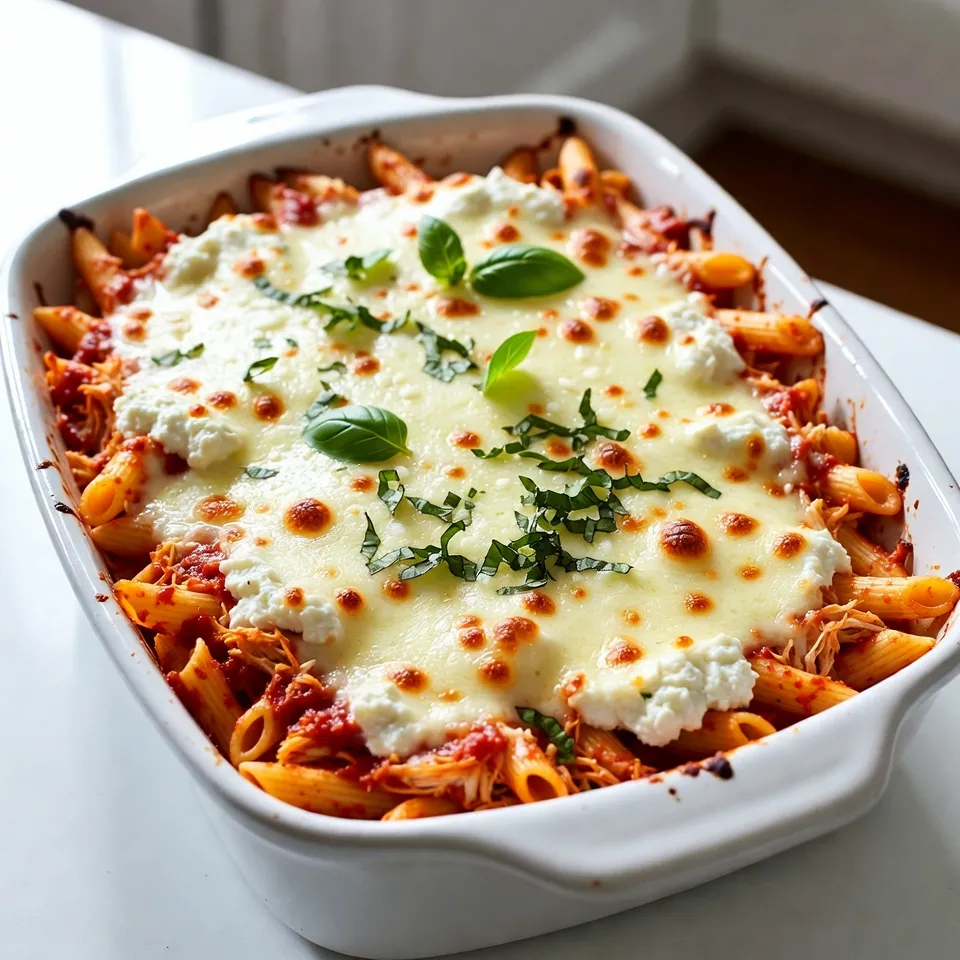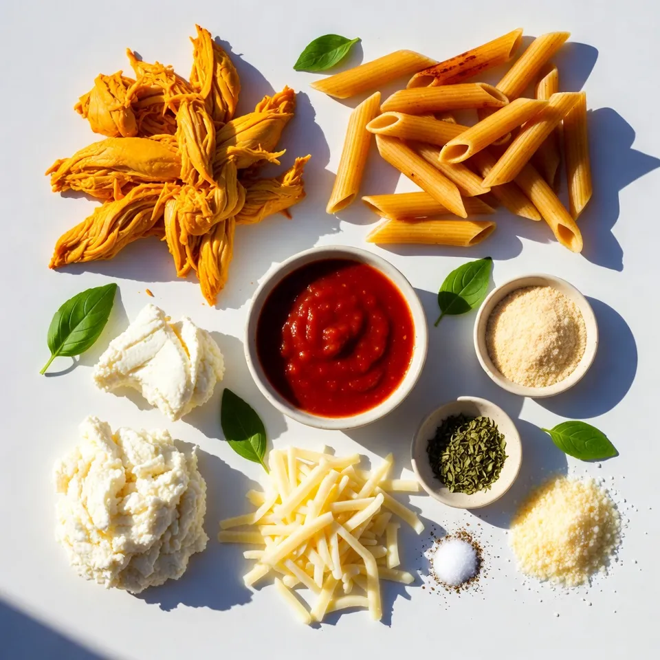 • Combine the shredded chicken, cooked penne pasta, marinara sauce, ricotta cheese, garlic powder, Italian herbs, salt, and pepper.