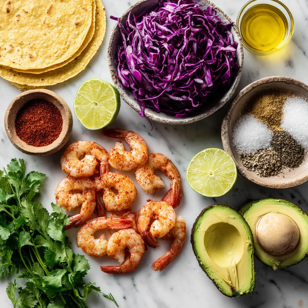 - To assemble the tacos, place a few shrimp on each tortilla, then top with shredded cabbage and avocado slices.