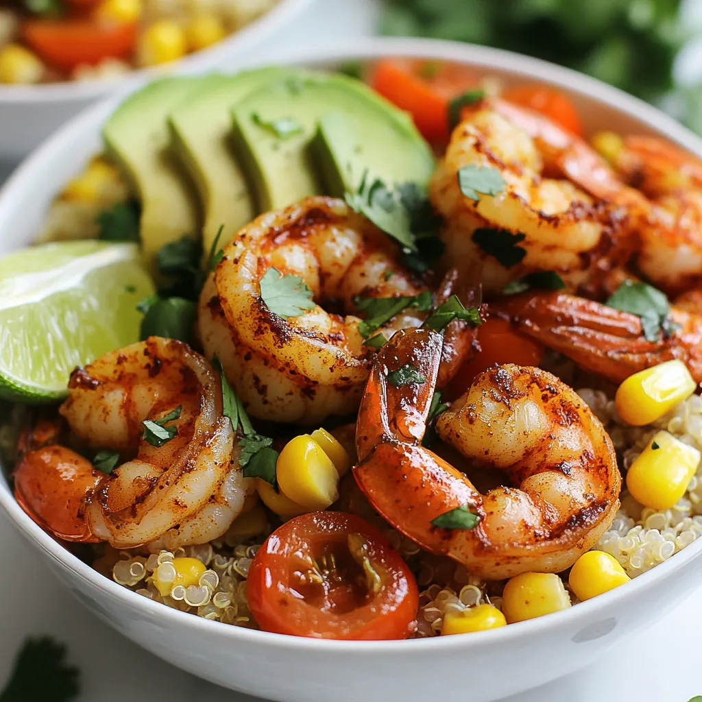 - To assemble the bowls, start with a base of quinoa, top with cooked shrimp, sautéed tomatoes, corn, and diced avocado. Garnish with fresh cilantro.