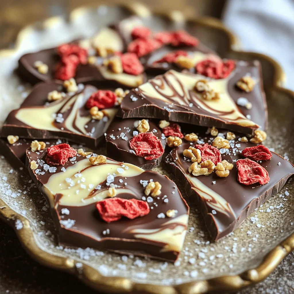 ![- 2 cups dark chocolate chips - 1 cup white chocolate chips - 1 cup freeze-dried strawberries The main stars of this treat are dark and white chocolate chips. They blend well for a great taste. The freeze-dried strawberries add a fruity crunch and bright color. This combo makes each bite a delight. - 1/2 cup crushed walnuts - Sea salt for sprinkling You can add crushed walnuts for extra texture and flavor. A light sprinkle of sea salt gives a nice contrast to the sweet chocolate. Both are not must-haves but can enhance your bark. - Microwave-safe bowls - Baking sheet - Parchment paper You need a few tools to make this bark. Microwave-safe bowls help melt the chocolate easily. A baking sheet holds the bark while it sets, and parchment paper ensures it comes off cleanly. These simple items make your cooking process smooth. - Line with parchment paper - Ensure even coverage First, take a baking sheet and line it with parchment paper. This step is key. It helps the bark lift off easily once it's set. Make sure the paper covers the whole sheet. No gaps! - Microwave method for efficiency - Importance of stirring Next, grab a microwave-safe bowl. Add the dark chocolate chips into this bowl. Microwave the chocolate in 30-second bursts. After each burst, take it out and stir. Keep going until it's smooth and melted. Stirring helps avoid burning the chocolate. - Pouring dark chocolate onto baking sheet - Melting and drizzling white chocolate Now, pour the melted dark chocolate onto your lined baking sheet. Use a spatula to spread it into an even layer. This makes for a nice base. Then, take another microwave-safe bowl for the white chocolate chips. Melt them using the same 30-second method. Once melted, drizzle the white chocolate over the dark layer. Use a toothpick to swirl them together. This creates a pretty marbled look. Finally, sprinkle the freeze-dried strawberries and crushed walnuts over the top. Press them down gently so they stick. A light sprinkle of sea salt adds a great flavor contrast. Now, place the baking sheet in the fridge for about 30 minutes. When the chocolate hardens, remove it and break it into pieces. Enjoy your treat! For more details, check the [Full Recipe]. To make great chocolate bark, the type of chocolate matters. Use high-quality chocolate chips for the best taste. They melt smoothly and stay creamy. For perfect melting, heat chocolate in 30-second bursts. Stir well after each interval. This keeps the chocolate from burning. To create a fun marbled effect, drizzle the white chocolate over the dark chocolate. Use a toothpick or skewer to swirl them together. Be gentle to keep the design nice. If you want to get fancy, try using a fork or a spatula. Both work well for swirling. Evenly spread freeze-dried strawberries and walnuts over the chocolate. This helps to get a nice mix in every bite. After spreading, press down lightly on the toppings. This ensures they stick well to the chocolate. The more they stick, the better the bark will hold together. For more detailed steps, see the Full Recipe. {{image_2}} You can switch up the chocolate for your bark. If you prefer sweeter flavors, try milk chocolate instead of dark. Milk chocolate gives a creamy taste. White chocolate is another fun choice. It adds a nice contrast to the fruity flavors. You can also use flavored chocolate. Think about adding mint chocolate or orange chocolate for a twist. Toppings can change the game for your bark. Nuts like almonds or pecans add a nice crunch. You can also crush up candies for fun colors and flavors. Dried fruits like apricots or cranberries work well, too. For added freshness, use fresh fruits. Sliced bananas or raspberries can brighten up your bark. Just remember to use fresh fruit right before serving. Make your chocolate bark special for holidays or events. For Valentine's Day, use heart-shaped sprinkles. For Halloween, add orange and black candies. You can think outside the box with flavor combos. Try pairing dark chocolate with spicy chili flakes for a kick. Or use coconut and lime for a tropical feel. The options are endless! For the complete recipe, check out the [Full Recipe]. To keep your chocolate covered strawberry bark fresh, use an airtight container. This will stop air from getting in. It will keep the bark from drying out and losing its taste. I like using a glass or plastic container with a tight lid. You can also wrap the bark in plastic wrap before placing it in the container. This adds extra protection. Homemade chocolate bark can last about two weeks when stored correctly. If you notice any white spots or a dull look, it’s time to toss it. These signs mean the chocolate has gone bad. Always check for any off smells too. If it smells strange, don’t eat it. You can freeze chocolate bark if you want to keep it longer. First, break the bark into pieces. Then, place the pieces on a baking sheet lined with parchment paper. This stops them from sticking together. Freeze the pieces for about two hours. After that, move them to a freezer-safe bag. When you want to eat it, let it sit at room temperature for a bit. You can also microwave it for a few seconds to warm it up. Enjoy your treat! Yes, you can use chocolate bars. Just chop them into small pieces. This helps them melt evenly. Place the chopped chocolate in a microwave-safe bowl. Heat in 30-second bursts, stirring each time. Keep an eye on it to prevent burning. Once melted, you can spread it like you do with chips. Absolutely! You can use vegan chocolate. Look for dark chocolate that has no milk. Many brands make dairy-free chocolate chips. You can also try using cacao butter for a creamy texture. Add in your favorite toppings, like nuts or coconut, to keep it fun and tasty. Check for a firm texture. The chocolate should feel hard when you touch it. You can also look for a shiny surface. If it looks dull, it may need more time. Place it in the fridge for about 30 minutes. Once it's set, you can break it i