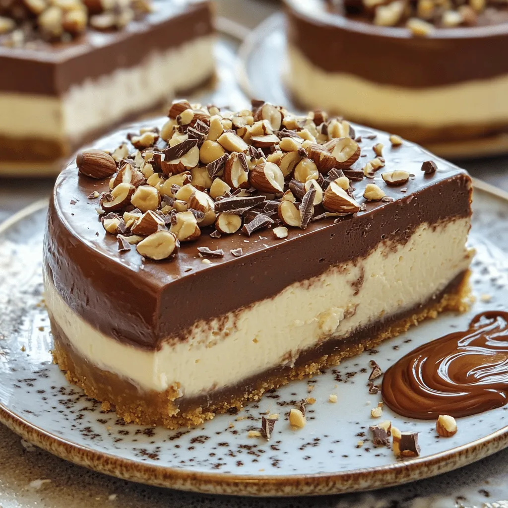- 1 ½ cups graham cracker crumbs - ½ cup unsalted butter, melted - 2 cups cream cheese, softened - 1 cup powdered sugar - 1 cup hazelnut spread - 3 large eggs - 1 teaspoon vanilla extract - 1 cup sour cream - ¼ cup cocoa powder - ½ cup crushed hazelnuts (for topping) - Chocolate shavings (for garnish) - Gluten-free graham cracker crumbs - Dairy-free cream cheese options The ingredients for this chocolate hazelnut cheesecake are simple yet effective. The graham cracker crumbs form a crunchy base. The melted butter binds them together. Cream cheese adds a rich, creamy texture. Powdered sugar balances the flavors with sweetness. Hazelnut spread gives that irresistible nutty taste. Eggs help set the cheesecake, making it firm. Vanilla extract adds warmth and depth. Sour cream contributes a slight tang. Cocoa powder gives a rich chocolate flavor. Crushed hazelnuts on top add a nice crunch. Finally, chocolate shavings make it look fancy and inviting. If you want to switch up the recipe, try gluten-free graham cracker crumbs. They work well for those with gluten issues. You can also use dairy-free cream cheese for a lactose-free option. This way, everyone can enjoy this divine dessert delight! - Preheat oven to 325°F (160°C). - In a bowl, combine 1 ½ cups of graham cracker crumbs with ½ cup of melted butter. - Press this mix firmly into the bottom of a 9-inch springform pan. - In a large bowl, beat 2 cups of softened cream cheese with 1 cup of powdered sugar until smooth. - Add 1 cup of hazelnut spread and mix until well combined. - Add 3 large eggs, one at a time, mixing well after each. - Stir in 1 teaspoon of vanilla extract, 1 cup of sour cream, and ¼ cup of cocoa powder. Mix until everything is smooth. - Pour the cheesecake batter over the cooled crust. Smooth the top with a spatula. - Bake in the preheated oven for 55 to 60 minutes, or until the center is set but slightly jiggly. - Turn off the oven and crack the door. Let the cheesecake cool in the oven for about 1 hour. This helps prevent cracks. To make a smooth cheesecake, proper mixing is key. Start with softened cream cheese. This helps it blend well with the sugar. Mix on low speed to avoid air bubbles. Air bubbles can cause cracks later. Bring all your ingredients to room temperature. This helps them mix better. Cold eggs or cream cheese can lead to lumps. So, let them sit out for about 30 minutes before you start. Cooling your cheesecake slowly is important. After baking, turn off the oven. Crack the door and let it cool for an hour. This helps prevent cracks on the surface. Once it's cool, refrigerate it for at least four hours. For the best texture, chill it overnight. The longer it sits, the better the flavors meld together. When serving, think about how to make it look nice. Use elegant dessert plates for a classy touch. Drizzle some extra hazelnut spread on the side for added richness. Pair your cheesecake with a nice drink. Coffee or a glass of dessert wine works well. These drinks enhance the chocolate and hazelnut flavors. {{image_2}} You can make this cheesecake even more special. Adding coffee or espresso makes a great mocha cheesecake. The coffee enhances the chocolate flavor. Just mix in 1-2 teaspoons of instant coffee or espresso powder with the cream cheese. Another fun twist is to add orange zest. Zest from one orange brightens the flavor of the cheesecake. It gives a fresh, citrusy note that pairs well with chocolate. Just fold it into the filling before baking. If you need gluten-free options, use gluten-free graham cracker crumbs. They work just like regular crumbs. This keeps your crust tasty and safe for those avoiding gluten. For vegan adaptations, swap cream cheese for a dairy-free version. Use a plant-based hazelnut spread too. Replace eggs with flax eggs or a commercial egg replacer. This way, everyone can enjoy the cheesecake. You can get creative with toppings. Fresh fruits like strawberries or raspberries add color and flavor. Drizzling chocolate or caramel sauce over the top makes it even more indulgent. Pairing cheesecake with ice cream adds a fun texture. Vanilla or hazelnut ice cream works well. The cold creaminess balances the rich cheesecake. Serve a slice of cheesecake with a scoop of ice cream for a perfect dessert treat. To keep your cheesecake fresh, store it in the fridge. Place it in an airtight container or wrap it tightly with plastic wrap. This keeps the flavors intact and prevents it from drying out. If you want to cover it, use aluminum foil. Just make sure it does not touch the top of the cheesecake. If you have extra cheesecake, you can freeze it. First, let it cool completely. Then, wrap it tightly in plastic wrap and aluminum foil. This protects it from freezer burn. You can freeze it for up to three months. When you're ready to eat it, move it to the fridge to thaw overnight. This keeps it creamy and tasty. Chocolate hazelnut cheesecake lasts about five days in the fridge. After that, it may lose its best taste and texture. If frozen, the cheesecake is good for three months. Enjoy your cheesecake while it’s fresh for the best flavor! Can I substitute yogurt for sour cream? Yes, you can use plain yogurt. It will give a similar tangy flavor and creamy texture. Greek yogurt works well too. Just keep the amount the same. What causes cracks in cheesecake and how to prevent them? Cracks often form from baking at high heat or overmixing. To prevent them, bake at a lower temperature. Let the cheesecake cool slowly in the oven with the door ajar. This helps avoid sudden temperature changes. How do I know when the cheesecake is done? Look for the edges to be firm while the center is slightly jiggly. The cheesecake will set as it cools. A toothpick inserted should come out clean. What's the best way to slice cheesecake for serving? Use a sharp knife or a cake slicer. Dip the knife in warm water and wipe it dry between cuts. This gives you clean, smooth slices. Can I use a different