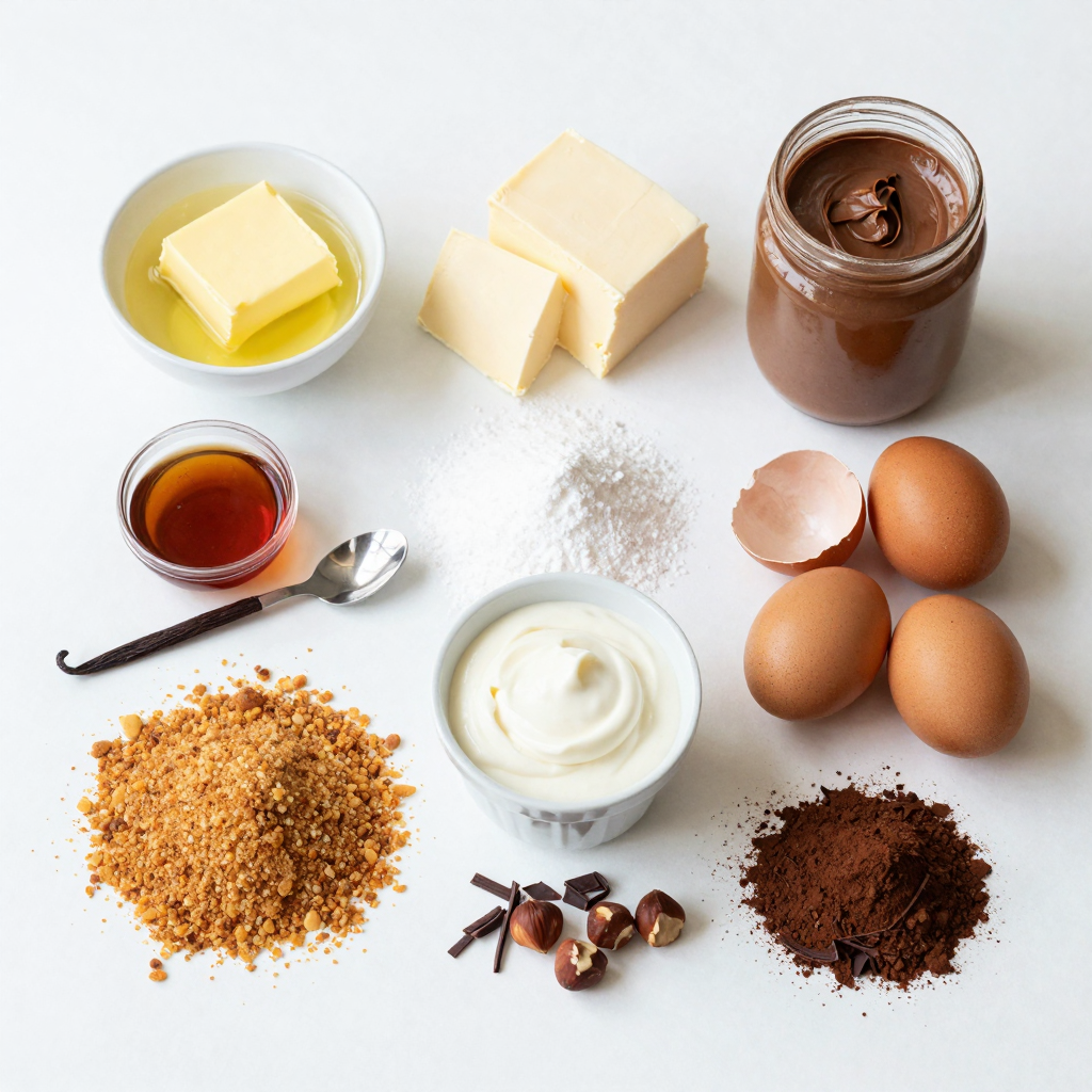 The ingredients for this chocolate hazelnut cheesecake are simple yet effective. The graham cracker crumbs form a crunchy base. The melted butter binds them together. Cream cheese adds a rich, creamy texture. Powdered sugar balances the flavors with sweetness. Hazelnut spread gives that irresistible nutty taste. Eggs help set the cheesecake, making it firm. Vanilla extract adds warmth and depth. Sour cream contributes a slight tang. Cocoa powder gives a rich chocolate flavor. Crushed hazelnuts on top add a nice crunch. Finally, chocolate shavings make it look fancy and inviting.