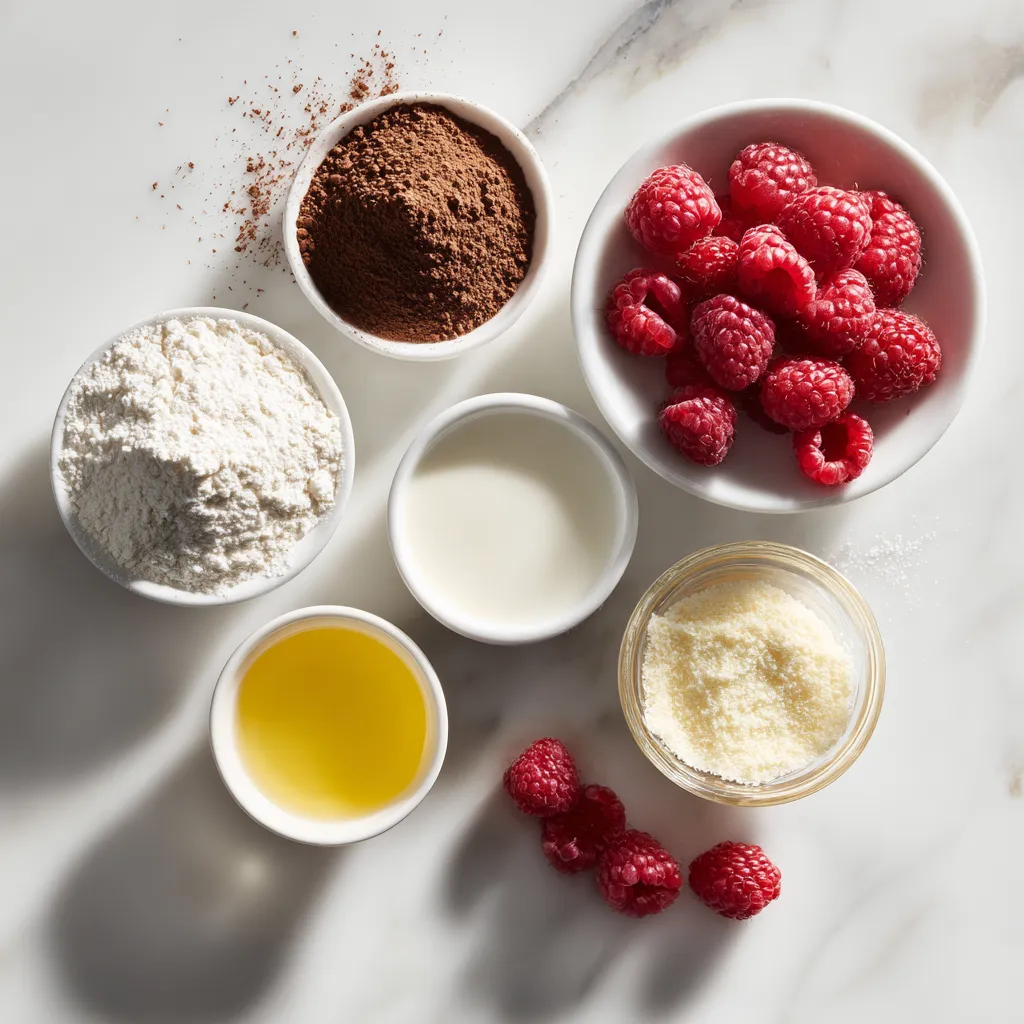 Start by gathering your ingredients. You need flour, sugar, cocoa powder, baking powder, salt, milk, vegetable oil, vanilla, and raspberries.
