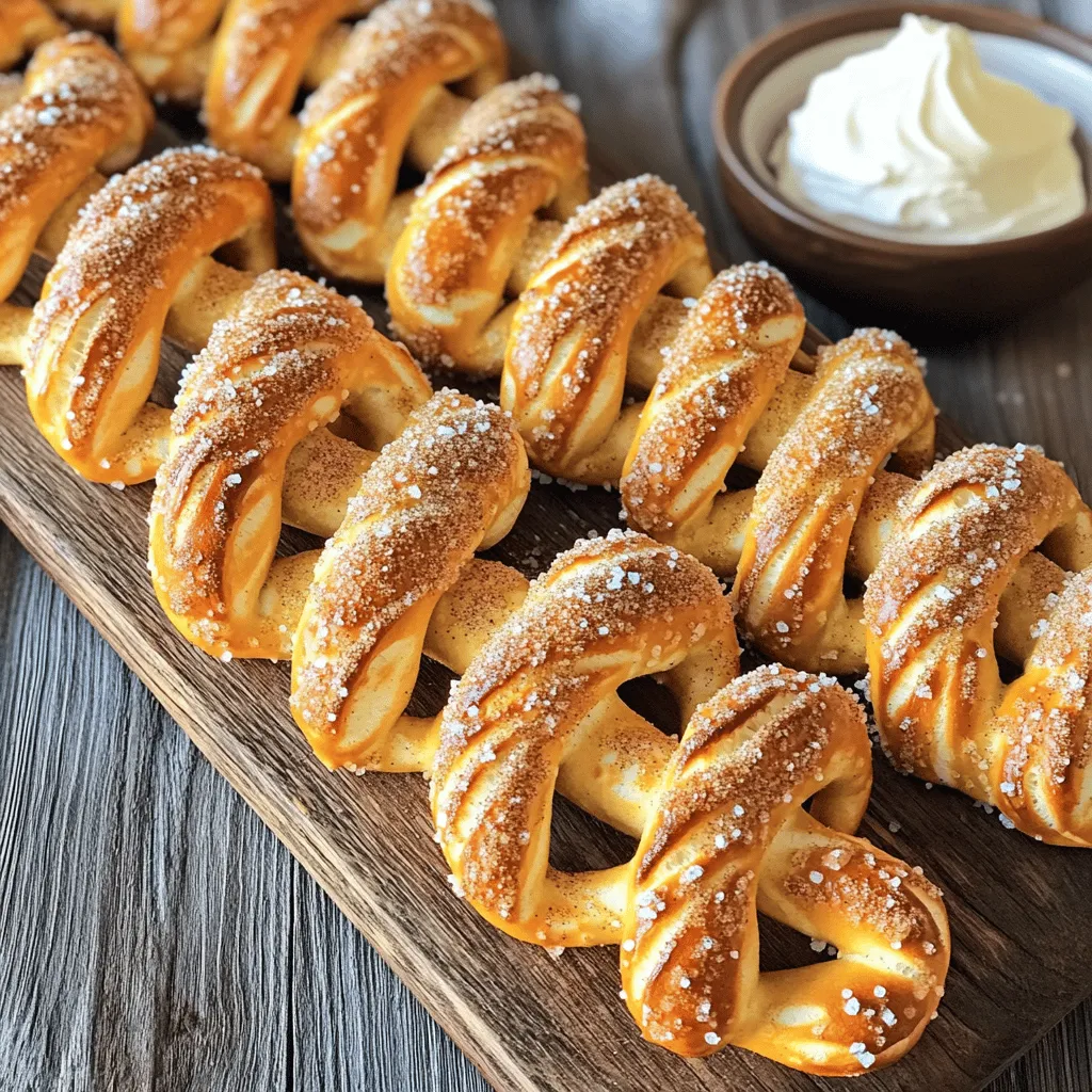 ![- 1 ½ cups warm water (110°F to 115°F) - 2 tablespoons granulated sugar - 1 packet (2 ¼ teaspoons) active dry yeast - 4 cups all-purpose flour - 1 teaspoon kosher salt - ½ cup baking soda - 1 large egg (for egg wash) - ½ cup granulated sugar (for coating) - 2 tablespoons ground cinnamon - Coarse sea salt for sprinkling For our cinnamon sugar pretzel twists, we start with warm water. This helps activate the yeast. The sugar feeds the yeast, making it rise. You need active dry yeast to create that fluffy texture. All-purpose flour makes up the bulk of the dough. The kosher salt enhances the flavor. Next, we add baking soda. This gives our pretzels that classic chewy bite. The large egg is crucial for the egg wash. It gives the pretzels a shiny, golden finish. The granulated sugar and ground cinnamon mix together for that sweet topping. Finally, sprinkle coarse sea salt on top for a nice contrast. - Flour Alternatives: You can use whole wheat flour for a nuttier taste. Gluten-free flour works too, but it may change the texture. - Vegan Egg Wash: Use a mixture of almond milk and maple syrup instead of egg. It gives a nice color while keeping it vegan. - Healthier Sugar Options: Try coconut sugar or a sugar substitute for a lower-calorie option. Just remember, it may alter the taste slightly. With these ingredients, you can create a delightful treat that everyone will love! Check out the Full Recipe for more details on how to make these pretzel twists. To start, we need to activate the yeast. In a mixing bowl, combine 1 ½ cups of warm water (110°F to 115°F) and 2 tablespoons of granulated sugar. Sprinkle in 1 packet of active dry yeast. Let it sit for about 5-10 minutes until it looks frothy. This step is crucial. It wakes up the yeast and gets it ready to help our dough rise. Next, we prepare the dough. In a large bowl, mix 4 cups of all-purpose flour and 1 teaspoon of kosher salt. Gradually add the frothy yeast mixture. Stir until a dough forms. Then, knead the dough on a lightly floured surface for about 5-7 minutes. You want it to be smooth and elastic. If the dough is too sticky, add a little more flour. Once it feels right, place it in a greased bowl. Cover it and let it rise for about 1 hour, or until it doubles in size. Now for the fun part—shaping the pretzels! After the dough has risen, punch it down gently. Divide the dough into 8 equal pieces. Roll each piece into a long rope, about 24 inches long. To shape, twist the rope into a pretzel form. Pinch the ends together to secure the shape. Place the shaped pretzels on a prepared baking sheet. Boiling the pretzels is next. This step is key for a chewy texture. In a large pot, bring 10 cups of water and ½ cup of baking soda to a boil. Carefully add each pretzel to the boiling water. Boil each one for 30 seconds. Use a slotted spoon to remove them and place them back on the baking sheet. For baking, preheat your oven to 425°F (220°C). Brush each pretzel with a beaten egg for a shiny finish. In a small bowl, mix ½ cup of granulated sugar with 2 tablespoons of ground cinnamon. Sprinkle this mix generously over each pretzel. Then, add a pinch of coarse sea salt for extra flavor. Bake the pretzels for 12-15 minutes. Keep an eye on them. You want them to turn golden-brown. When they are done, let them cool slightly before serving. Enjoy your warm, delicious cinnamon sugar pretzel twists! For the complete steps, check out the Full Recipe. You can make your pretzels even better by adding a few extras. Try mixing in some vanilla for a sweet touch. A pinch of nutmeg can also add warmth and spice. For the best cinnamon-sugar coating, use fresh cinnamon. Mix the sugar and cinnamon well before sprinkling. Make sure to coat each pretzel evenly. This step really boosts the flavor and makes each bite special. Having the right tools helps make great pretzels. You’ll need a mixing bowl and a large pot for boiling. A sturdy rolling pin helps shape the dough into ropes. Use a baking sheet lined with parchment paper to prevent sticking. A pastry brush is handy for applying the egg wash. These tools will make your pretzel-making experience easier and more fun. Sometimes, things can go wrong. If your pretzels don’t rise, check your yeast. It needs warmth to activate. If the dough feels too sticky, add a bit more flour while kneading. For a dry dough, mix in a little water until it feels smooth. These tips will help you fix any dough problems and get those pretzels just right. For more detailed steps, check out the [Full Recipe]. {{image_2}} Creating different versions of cinnamon sugar pretzel twists can be fun and tasty. Here are some ideas to try. - Cheese-stuffed pretzel twists: For a cheesy treat, roll some cheese into your dough. Use mozzarella or cheddar for a gooey middle. Bake as usual, and enjoy the surprise inside. - Herb-infused pretzel dough: Mix herbs like rosemary or thyme into your dough. This adds a lovely flavor. It pairs well with soups or salads, making it a great snack. - Drizzling with chocolate or icing: After baking, drizzle melted chocolate over the pretzels. You can also use icing for a sweeter touch. This makes them extra special for dessert. - Incorporating nuts or dried fruits: Add chopped nuts like pecans or walnuts for crunch. Dried fruits like raisins or cranberries add sweetness. Mix them into the dough before shaping your pretzels. - Pumpkin spice variation for fall: Add pumpkin spice to your dough for a cozy fall flavor. This makes your pretzels perfect for autumn gatherings. - Peppermint twist for the holidays: Use peppermint extract in your dough for a festive touch. Top with crushed candy canes after baking for a holiday treat. Explore these variations to find your favorite twist on this classic snack! For the full recipe, check out the linked section. To keep your pretzel twists fresh, store them in an airtight container. This helps prevent them from getting stale. You can use a plastic or glass con