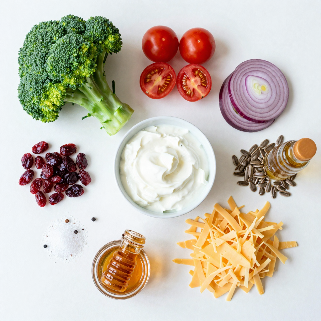 For this classic broccoli salad, you start with fresh produce. I love using bright green broccoli florets. They add a lovely crunch and color. Cherry tomatoes bring sweetness, while red onion adds a nice bite.