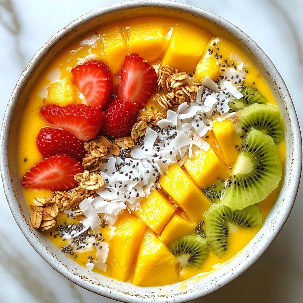 A refreshing and creamy smoothie bowl made with ripe mango, coconut milk, and topped with granola and fresh fruits.