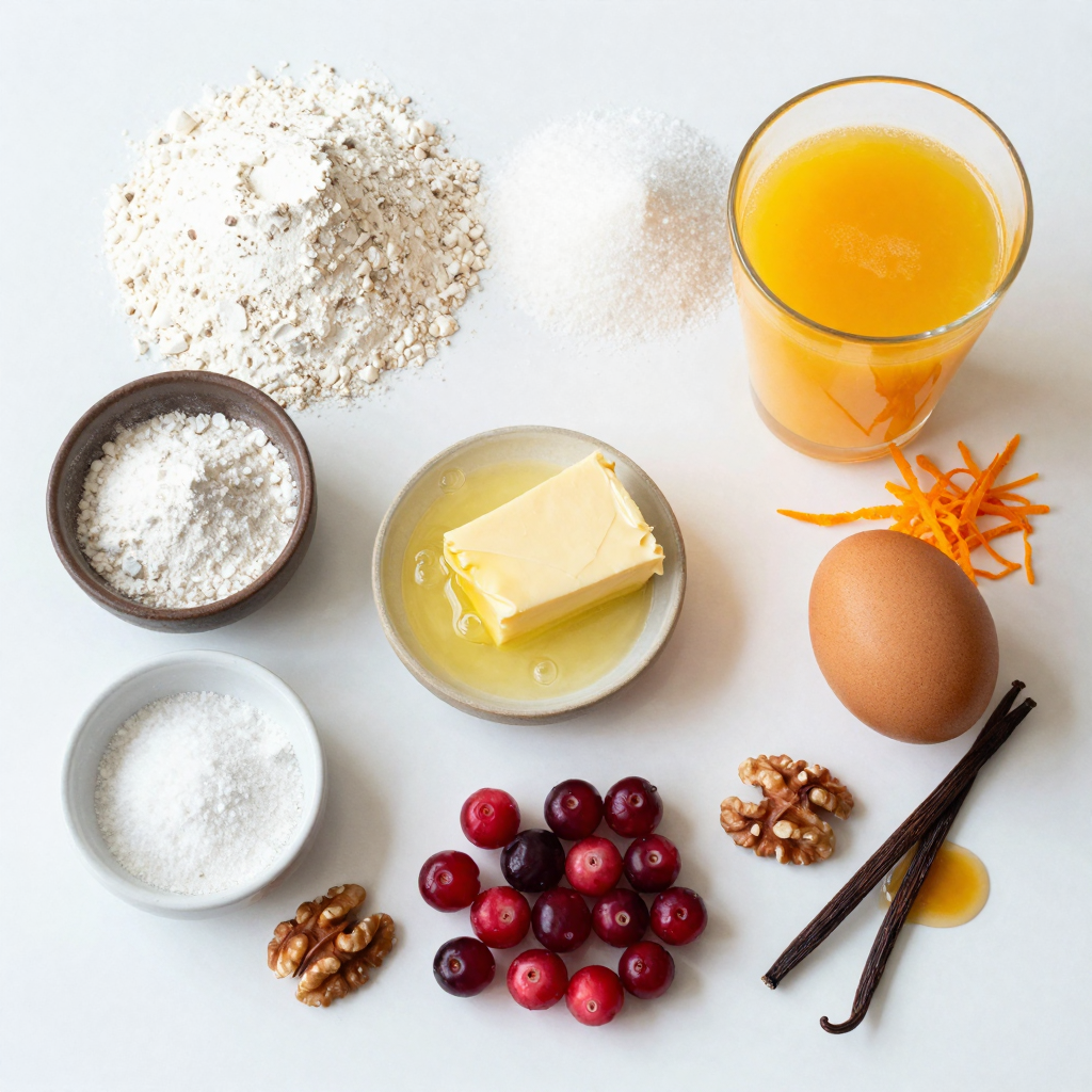 Next, melted unsalted butter gives moisture and richness. The egg binds everything together. Fresh orange juice and zest provide bright, citrusy notes. Cranberries add tartness and texture. If you like, nuts offer crunch and depth. Lastly, vanilla extract enhances the overall flavor.