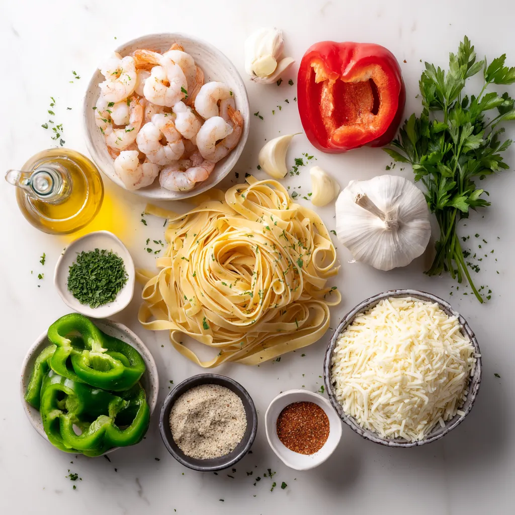 To create a rich, creamy Cajun shrimp pasta, you need these core ingredients. The fettuccine serves as the perfect base. Shrimp adds protein and a sweet flavor. Olive oil helps cook the shrimp and veggies. Onions and garlic add depth to the dish. Red and green bell peppers bring color and crunch. Heavy cream makes the sauce rich. Parmesan cheese gives it a savory kick. Cajun seasoning adds a warm, spicy touch. Salt and pepper balance the flavors.