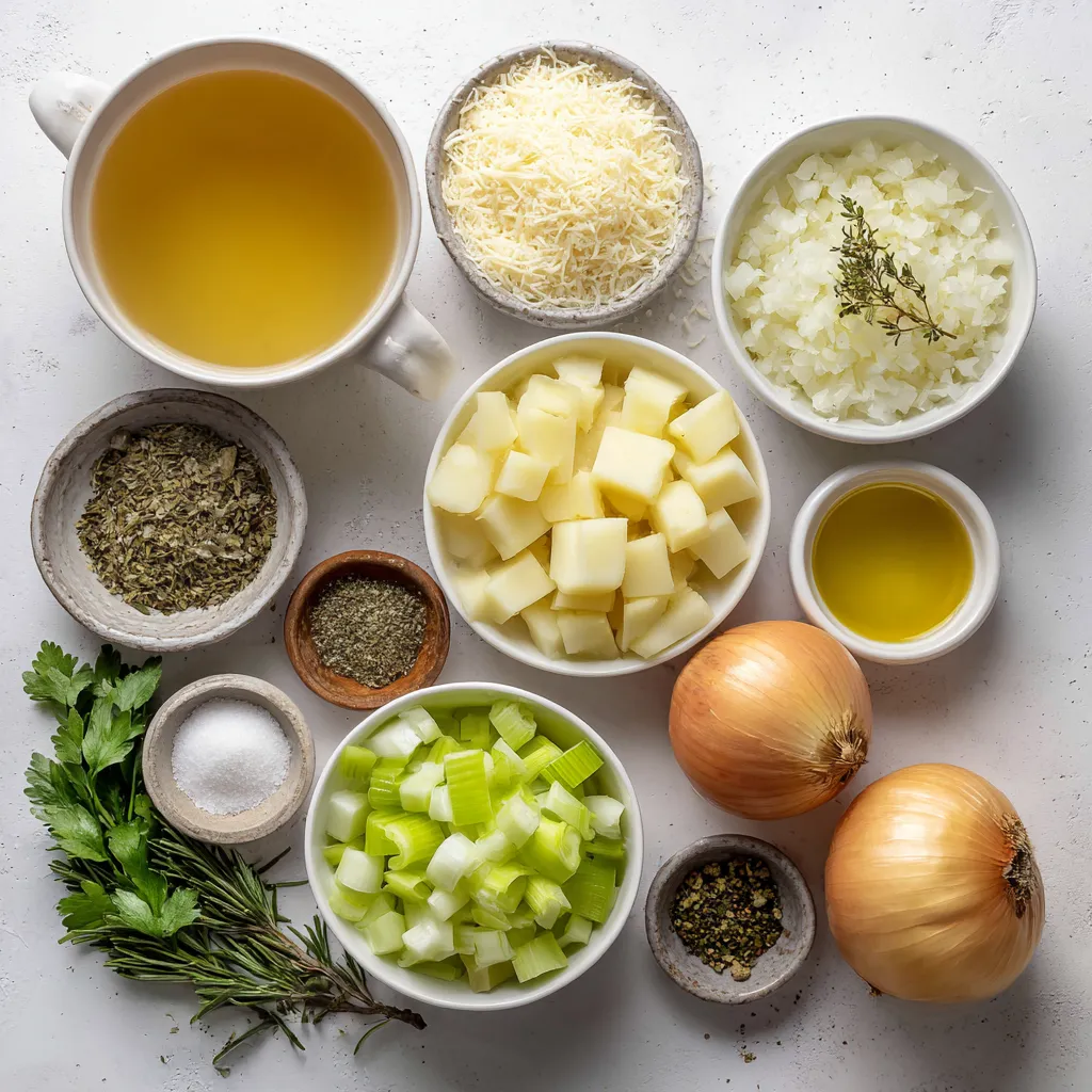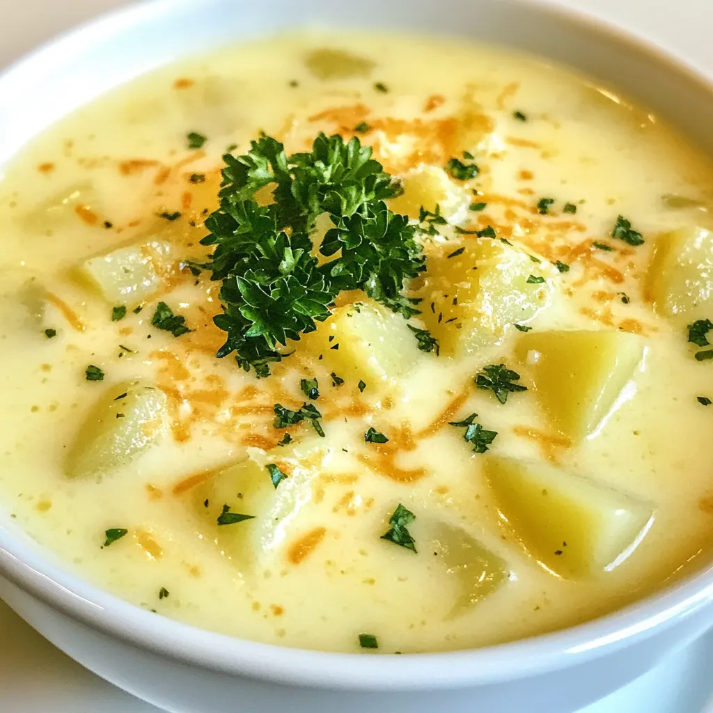 - 4 cups vegetable broth - 1 cup heavy cream - 1 cup grated Parmesan cheese For the soup, I use vegetable broth for a rich base. The heavy cream adds that smooth texture. Grated Parmesan gives the soup its delicious flavor. Each of these ingredients plays a key role in making the soup creamy and tasty. - 1 large onion, chopped - 5 cloves garlic, minced - 2 medium potatoes, peeled and diced Next, we have aromatics and vegetables. I love using onion and garlic. They add depth and warmth. The potatoes provide body and creaminess when blended. This mix makes the soup feel hearty and satisfying. - 1 teaspoon dried thyme - 1 teaspoon dried rosemary - Salt and pepper to taste Seasonings bring everything together. I use dried thyme and rosemary for a fragrant touch. Salt and pepper enhance all the flavors in the soup. These simple spices create a comforting, rich bowl of goodness. {{ingredient_image_1}} First, heat olive oil in a large pot over medium heat. Add the chopped onion and diced celery. Sauté these for about five minutes until they soften. The smell will fill your kitchen with warmth. Next, stir in the minced garlic. Cook for one to two minutes until it becomes fragrant. This garlic will give the soup a rich flavor. Now, add the diced potatoes and vegetable broth to the pot. Sprinkle in the dried thyme and rosemary. Bring the mixture to a simmer. Let it cook for about 15 to 20 minutes. You want the potatoes to be tender. This step builds the soup's base and depth of flavor. Once the potatoes are cooked, it's time to blend the soup. Use an immersion blender for this step. If you don’t have one, carefully transfer the soup to a countertop blender in batches. Blend until it's smooth and creamy. After blending, return the soup to the pot if needed. Stir in the heavy cream and grated Parmesan cheese. Mix well until the cheese melts. This is when the soup becomes truly creamy and rich. Season with salt and pepper to taste. Heat for an additional five minutes on low. Your soup is now ready to be served, garnished with fresh parsley and extra Parmesan if you like. To get a smooth, creamy texture, blend the soup well. I use an immersion blender for this. It makes the job easy and quick. If you don’t have one, pour the soup in batches into a regular blender. Just be careful, as hot soup can splatter. Choosing the right cheese is key. I always use fresh, grated Parmesan cheese. It melts well and gives a rich flavor. Avoid powdered cheese for the best results. To boost the flavor, I recommend using fresh herbs. Parsley and thyme add a nice touch. You can also try adding basil for a twist. For extra spice, consider adding a pinch of cayenne pepper or paprika. These spices give the soup a warm kick. Just remember to add them slowly and taste as you go. Pair this soup with crusty bread or a light salad. A fresh side makes the meal more complete. For garnishing, sprinkle fresh parsley on top. You can also add extra Parmesan for a nice finish. A drizzle of olive oil adds a lovely shine and depth of flavor. Pro Tips Use Fresh Herbs: Fresh herbs like thyme and rosemary can elevate the flavor of your soup significantly compared to dried herbs. Adjust Creaminess: For a lighter soup, you can substitute half of the heavy cream with additional vegetable broth or use a lower-fat cream alternative. Perfectly Blend: For a silky texture, be sure to blend the soup until completely smooth, and avoid over-blending to prevent it from becoming too frothy. Garnish Wisely: A sprinkle of freshly grated Parmesan and a few parsley leaves not only enhance presentation but also add a burst of flavor just before serving. {{image_2}} You can change a few ingredients for a different taste. If you want a dairy-free version, swap out heavy cream. Use coconut milk or cashew cream for a rich texture. Both options work well with the garlic and cheese flavors. For vegetable substitutions, consider using carrots or leeks. They add sweetness and depth to the soup. To make the soup heartier, add proteins like cooked chicken or shrimp. They pair well with the creamy base. If you want to switch up the cheese, try Gruyère or cheddar. Each cheese brings a unique flavor. Experimenting with different cheeses keeps the soup exciting and new. You can serve this soup as a classic soup or a chowder. A chowder is thicker and heartier, often with more chunky vegetables. If you prefer a thicker texture, add more diced potatoes or cream. For toppings, consider crispy bacon bits or croutons. Fresh herbs like basil or chives also add color and flavor. To keep your creamy garlic Parmesan soup fresh, you should store it properly. First, let the soup cool to room temperature. Then, transfer it to an airtight container. You can store it in the fridge for up to three days. If you want to keep it longer, freezing is a good option. Pour the soup into freezer-safe bags or containers. Make sure to leave some space for the soup to expand as it freezes. Your soup can last up to three months in the freezer. When you’re ready to enjoy your soup again, reheating it is easy. The best way to do this is on the stove. Pour your soup into a pot and heat it over medium-low heat. Stir it often to avoid hot spots. If you prefer the microwave, that works too. Place your soup in a microwave-safe bowl. Heat it in short bursts, stirring in between. This method helps keep the soup from separating. How long does this soup last? If you store it in the fridge, it stays good for three days. In the freezer, it lasts up to three months. Look for signs of spoilage before eating. If you see mold or notice an off smell, it’s best to throw it away. Keeping your soup safe to eat is important! Yes, you can use other cheeses. Mozzarella gives a nice stretch. Cheddar adds a bold flavor. Just remember, Parmesan has a unique taste. If you switch, adjust the salt. Some cheeses are saltier than Parmesan. This soup is gluten-free. The main ingredients, like broth and cream, do not have g