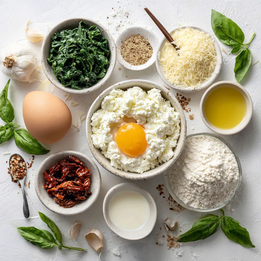To create creamy spinach ricotta ravioli, gather these simple ingredients. The fresh spinach and ricotta make a tasty filling. The Parmesan cheese adds a nice salty kick. The egg helps bind the filling and keeps it smooth.