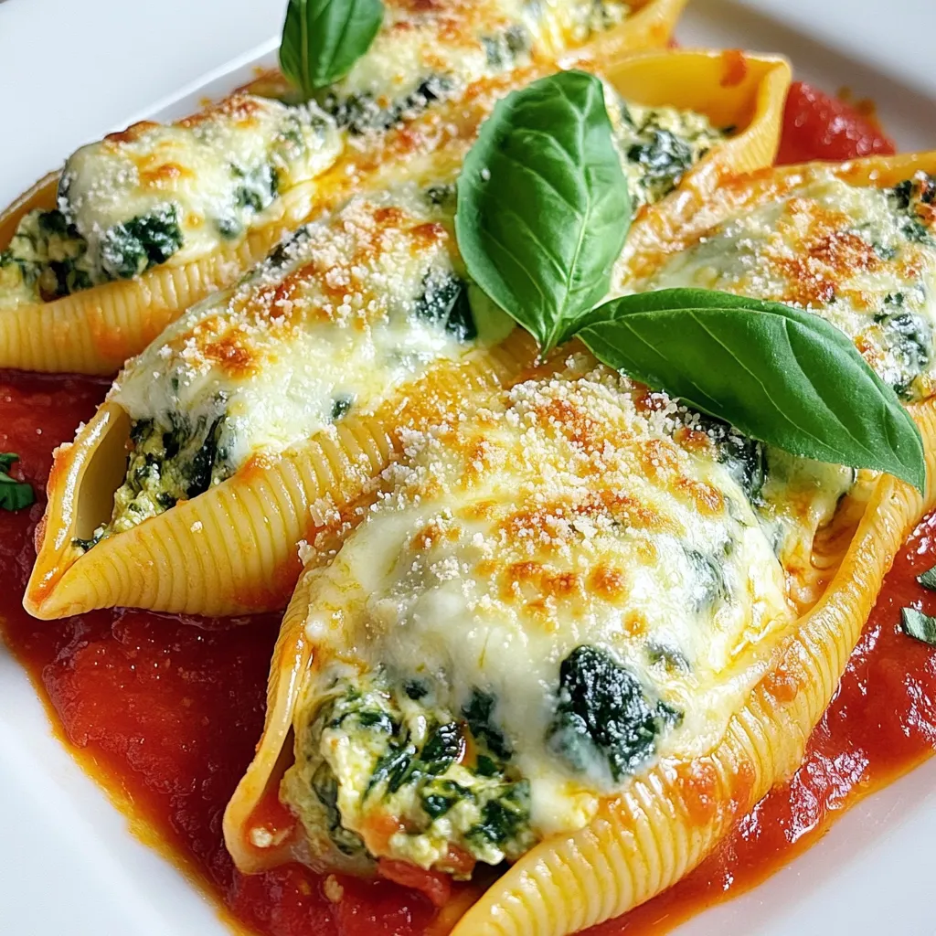 Delicious jumbo pasta shells filled with a creamy spinach and cheese mixture, baked in marinara sauce.