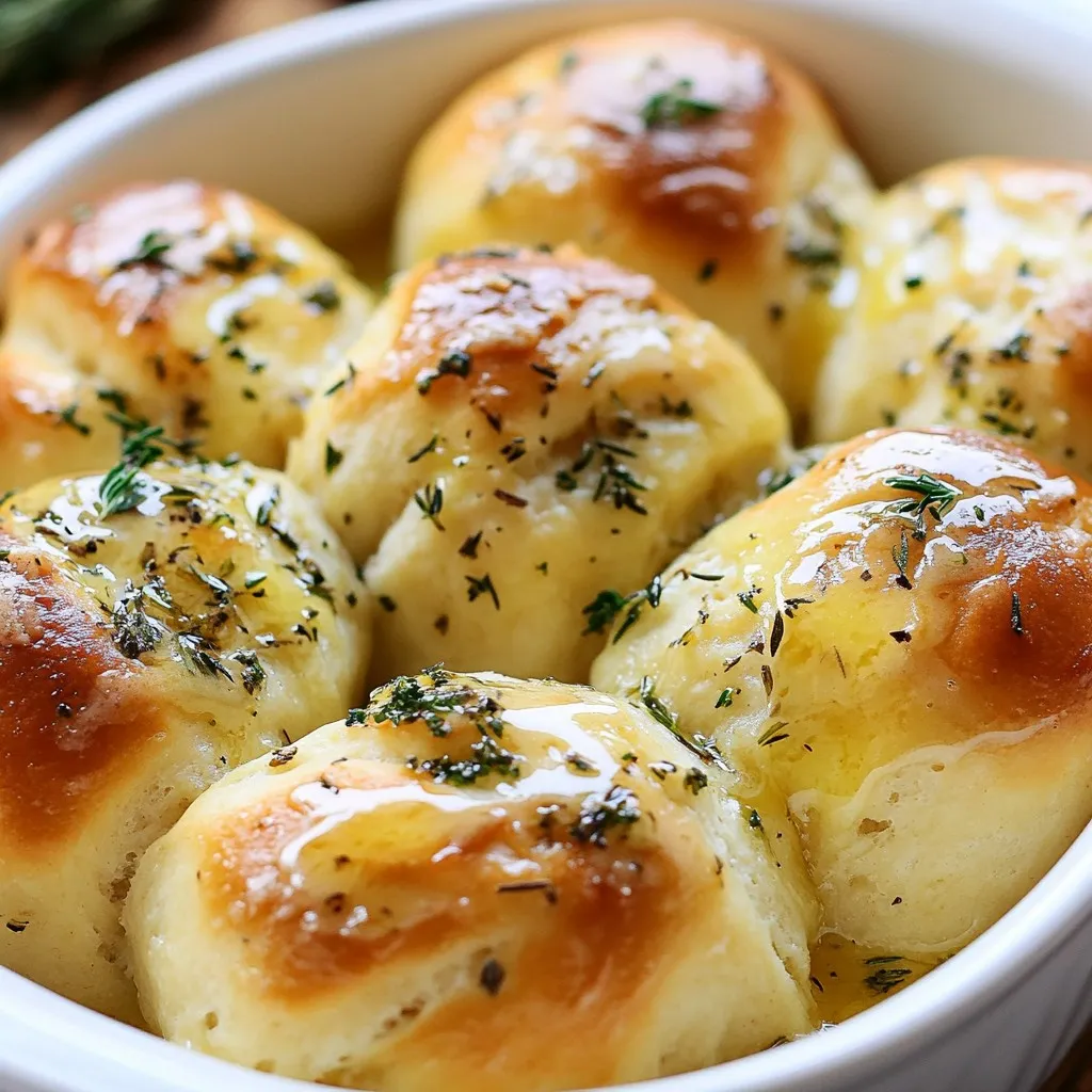 To make Garlic Herb Pull Apart Rolls, you need these main ingredients: - 3 cups all-purpose flour - 1 packet (2 ¼ tsp) active dry yeast - 1 teaspoon sugar - 1 teaspoon salt - 1 cup warm milk (110°F/45°C) - ¼ cup unsalted butter, melted - 2 tablespoons olive oil - 4 cloves garlic, minced - 1 tablespoon fresh rosemary, chopped - 1 tablespoon fresh thyme, chopped - 2 tablespoons fresh parsley, chopped - ½ teaspoon black pepper - 1 tablespoon melted butter (for brushing) These ingredients create soft, flavorful rolls that pull apart easily. You will need a few simple tools to make these rolls: - Mixing bowls - Whisk - Measuring cups and spoons - Baking dish - Clean cloth - Rolling pin - Oven Having the right tools makes the process smoother and more fun. If you want to change things up, you can substitute some ingredients. Here are a few ideas: - Use whole wheat flour instead of all-purpose flour for a healthier option. - Coconut milk or almond milk can replace regular milk. - Use garlic powder if you don’t have fresh garlic. - Other herbs like oregano or basil can replace rosemary, thyme, or parsley. - You can use margarine instead of butter if you need a dairy-free option. These swaps can help you customize the rolls to your taste. Enjoy experimenting! {{ingredient_image_1}} Start by mixing warm milk, sugar, and yeast in a small bowl. Use around 110°F (45°C) for the milk. Let it sit for 5 to 10 minutes. You want it to become frothy. This shows the yeast is active. If it does not foam, the yeast may be old. In a large mixing bowl, combine 3 cups of flour and 1 teaspoon of salt. Make a well in the center. Pour in your frothy yeast mixture along with ¼ cup of melted butter and 2 tablespoons of olive oil. Mix it all together until a soft dough forms. Knead the dough on a lightly floured surface for about 8 to 10 minutes. You want it smooth and elastic. Once you have your dough, place it in a greased bowl. Cover it with a clean cloth. Let it rise in a warm spot for about 1 hour until it doubles in size. After the dough has risen, preheat your oven to 375°F (190°C). Punch down the dough to release air. Divide it into 12 equal pieces and roll each into a ball. Now, in a small bowl, mix 4 minced garlic cloves, 1 tablespoon of chopped rosemary, 1 tablespoon of chopped thyme, 2 tablespoons of chopped parsley, and ½ teaspoon of black pepper. Dip each dough ball into this herb mix. Make sure they are well-coated. Arrange the coated balls in a greased baking dish, clustering them together. Cover the dish with a cloth again. Let them rise for another 30 minutes. Brush the tops with melted butter before baking. Bake for 20 to 25 minutes until they turn golden brown. Remove them from the oven and brush with more melted butter if you like. Serve them warm for a delightful treat! To ensure your dough rises well, use warm milk. The milk should be around 110°F (45°C). This heat wakes up the yeast. Mix the warm milk with sugar and yeast. Let it sit until frothy. This may take about 5-10 minutes. If the yeast doesn’t bubble, it’s not active. You may need fresh yeast. Place the dough in a warm spot. Cover it with a cloth to keep it warm and cozy. For a golden crust, watch the baking time. Bake at 375°F (190°C) for 20-25 minutes. Check for a rich, golden color. Brush the tops with melted butter before baking. This adds flavor and helps with browning. If the rolls brown too fast, cover them with foil. This helps cook the inside without burning the top. One mistake is not kneading the dough enough. Knead for about 8-10 minutes until it’s smooth. Another mistake is skipping the second rise. Letting the dough rise again helps it become fluffy. Don't pack the dough balls too tightly in the baking dish. They need space to expand. Lastly, avoid opening the oven door too often. This lets the heat out and can cause uneven baking. Pro Tips Proof Your Yeast: Always check that your yeast is active by letting it sit in warm milk with sugar until frothy. If it doesn't foam, your yeast may be dead, and you should replace it. Knead for Texture: Knead the dough until it is smooth and elastic to ensure your rolls have the perfect texture. This usually takes about 8-10 minutes. Herb Variations: Feel free to experiment with different herbs like basil or oregano for unique flavors. Just make sure they are fresh for the best taste. Storage Tips: Store leftover rolls in an airtight container at room temperature for up to two days. Reheat in the oven for a few minutes to regain their freshness. {{image_2}} You can easily change the herbs in these rolls. Try using basil for a sweet flavor. Oregano adds a nice Italian touch. For a bold taste, use sage or dill. Mix and match herbs to suit your taste. Just remember to keep the garlic. It adds a lovely kick that everyone loves. If you love cheese, this is for you. Add mozzarella or cheddar to the dough. After rolling the dough balls, place a small piece of cheese inside each. This way, you get a cheesy surprise when you pull a roll apart. Brush with garlic butter before baking for extra flavor. For a sweet twist, swap garlic for cinnamon. Use brown sugar instead of salt. Add raisins or chopped nuts for texture. Brush the rolls with melted butter and sprinkle with sugar. These sweet rolls make a great breakfast or dessert. Enjoy them warm with a hot drink. To keep your leftover Garlic Herb Pull Apart Rolls fresh, place them in an airtight container. This will help them stay soft. You can also wrap them in plastic wrap. They will last for up to three days at room temperature. If you want to keep them longer, consider freezing them. To freeze your rolls, first let them cool completely. Then, wrap each roll in plastic wrap. Next, place the wrapped rolls in a freezer-safe bag or container. Label it with the date. They can stay in the freezer for up to three months. When you're ready to eat, just thaw them in the fridge overnight. To reheat your rolls, you can use an oven or