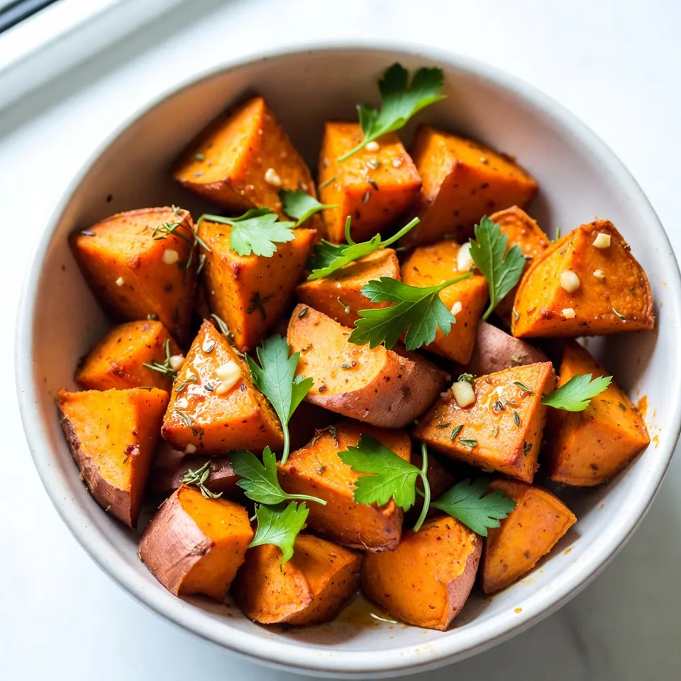 A delicious side dish featuring sweet potatoes roasted with garlic and herbs.