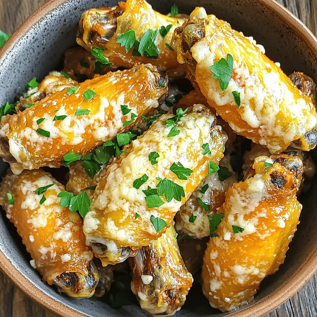 These ingredients combine to create a flavor-packed snack. The chicken wings are juicy and tender inside while crispy outside. The garlic and Parmesan cheese make them rich and tasty.