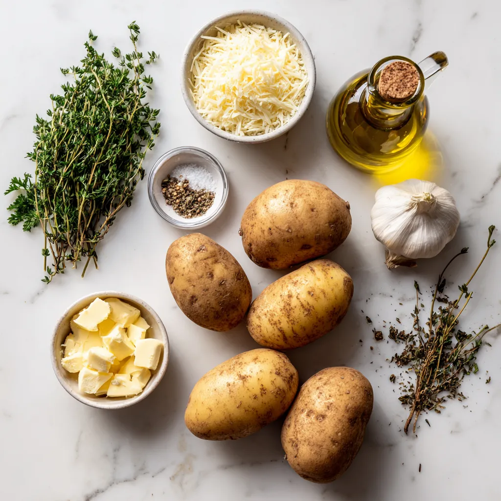 Each ingredient brings its own flavor and texture. The russet potatoes provide a fluffy inside and a crispy outside. Garlic adds a strong, savory taste. Butter enhances richness, while Parmesan offers that iconic cheesy bite. Olive oil helps with browning, and spices like salt, pepper, and thyme give depth to the dish. Lastly, fresh parsley brightens the plate and adds color.