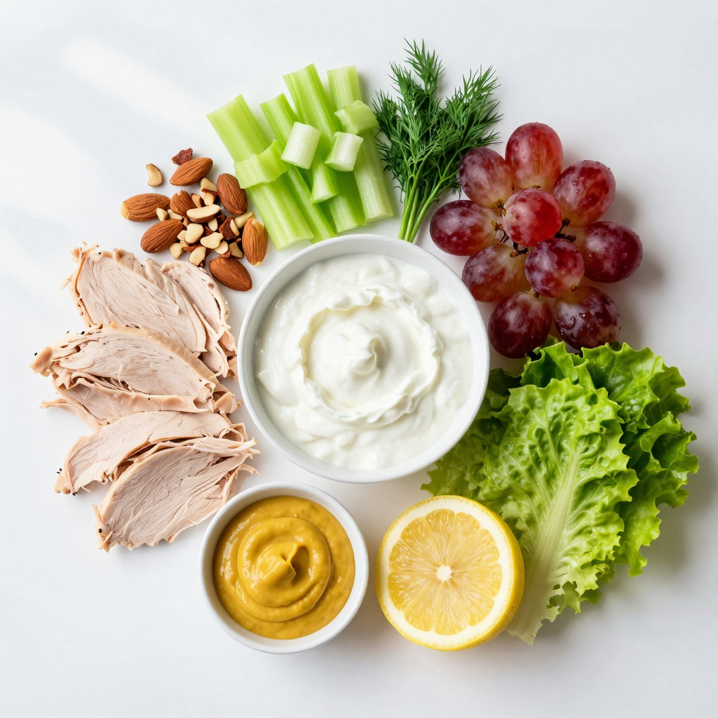 To start, take a large mixing bowl. Add 2 cups of shredded chicken breast and 1 cup of plain Greek yogurt. Mix them well until the chicken is fully coated in yogurt. This gives the salad a creamy base. Next, it’s time to add some crunch and sweetness. Stir in 1/4 cup of finely chopped celery and 1/4 cup of halved red grapes. Then, toss in 1/4 cup of chopped almonds for added texture. Finally, add 2 tablespoons of fresh dill, 1 tablespoon of Dijon mustard, and 1 tablespoon of lemon juice. This blend of flavors brightens the dish.