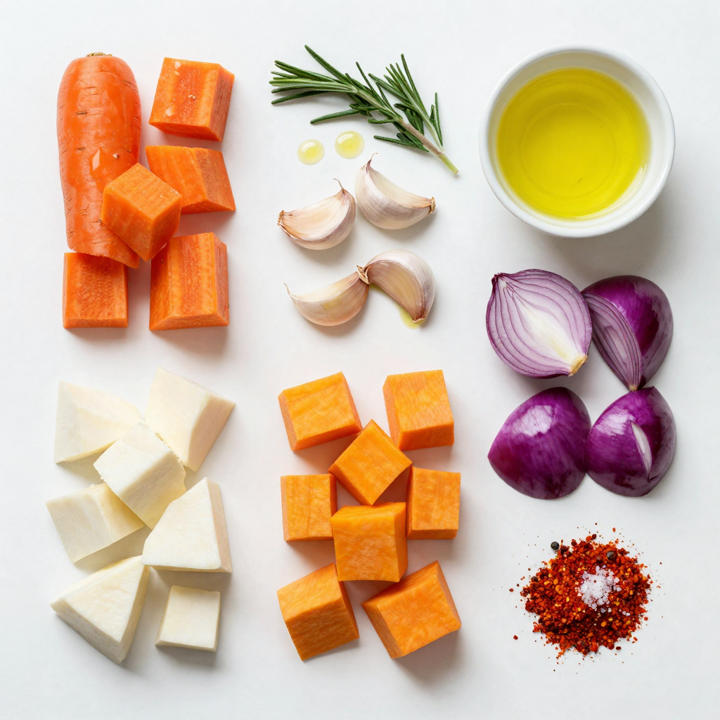Start by washing your root vegetables. Rinse each one under cold water to remove dirt. Next, peel the carrots, parsnips, and sweet potatoes. I use a vegetable peeler for this. Cut the carrots and parsnips into chunks, about one inch wide. Cube the sweet potatoes into similar sizes. Quarter the red onion and keep the garlic whole. This mix of shapes helps them cook evenly.