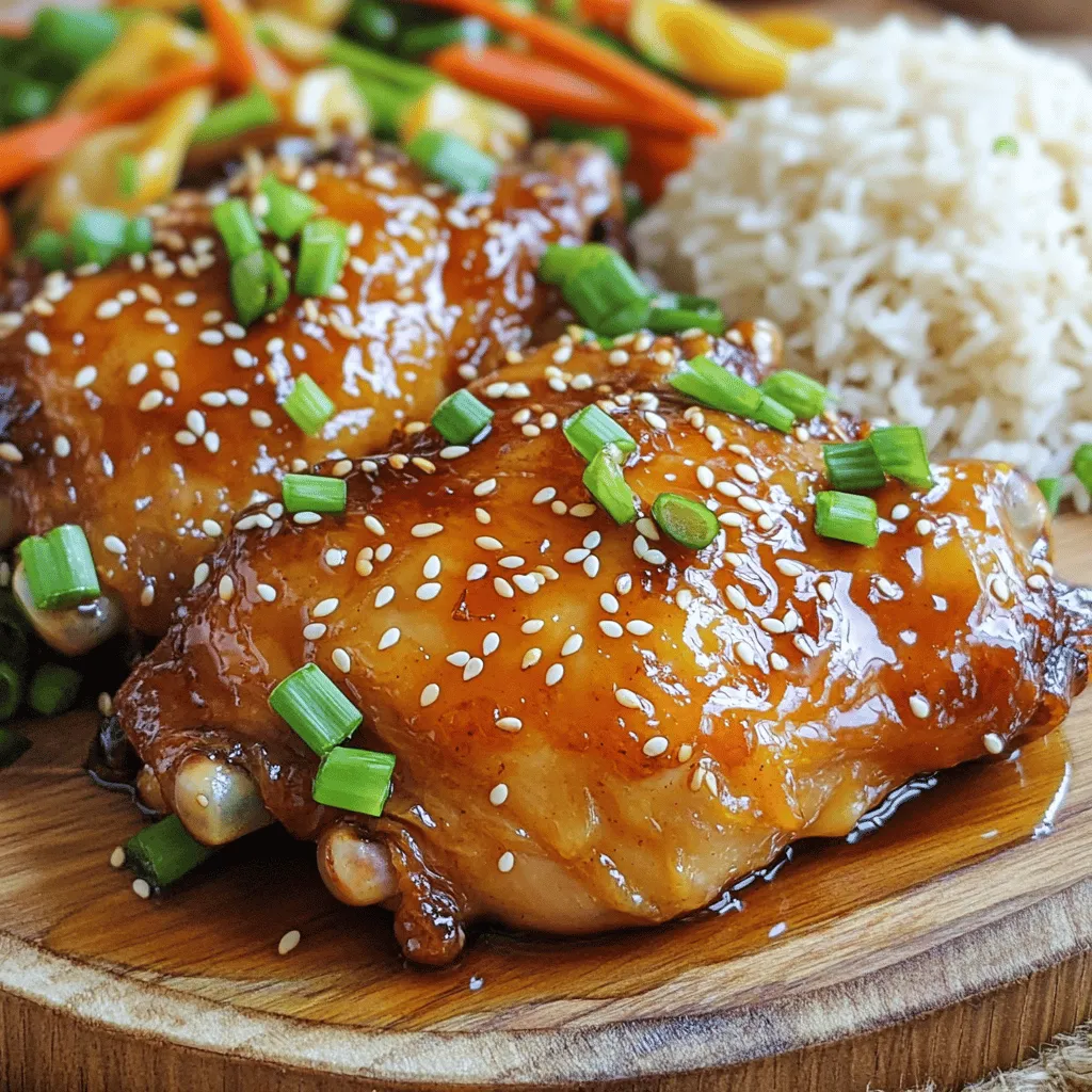 ![- 6 boneless, skinless chicken thighs - 1/4 cup honey - 1/4 cup soy sauce - 1 tablespoon rice vinegar - 4 cloves garlic, minced - 1 tablespoon fresh ginger, grated For this dish, the main star is the chicken thighs. They are juicy and tender. The honey adds sweetness, while soy sauce brings depth. Rice vinegar gives a nice tang. Garlic and ginger add a burst of flavor. - 2 green onions, thinly sliced - Sesame seeds Garnishes make the dish pop. Green onions add a fresh crunch. Sesame seeds add a nutty touch. These small details can elevate your meal. - 2 tablespoons olive oil - Salt and pepper to taste - 1 teaspoon sesame oil Seasoning is key for great taste. Olive oil helps with cooking and flavor. Salt and pepper enhance the natural flavors. Sesame oil adds a rich aroma. You can adjust these to fit your taste. For the complete recipe, check out the [Full Recipe]. To start, gather your ingredients. In a medium bowl, whisk together: - 1/4 cup honey - 1/4 cup soy sauce - 1 tablespoon rice vinegar - 4 cloves garlic, minced - 1 tablespoon fresh ginger, grated - 2 tablespoons olive oil - 1 teaspoon sesame oil Mix until smooth. This honey garlic blend will give your chicken a sweet and tangy taste. Next, place the 6 boneless, skinless chicken thighs into a large resealable plastic bag or bowl. Pour the marinade over the chicken. Make sure each piece gets coated well. Seal the bag or cover the bowl. Refrigerate the chicken for at least 30 minutes. For even better flavor, marinate for up to 4 hours. You can choose to grill or pan-sear your chicken. - Grilling: Preheat your grill to medium-high heat. - Pan-searing: Heat a large skillet over medium heat. Once ready, take the chicken out of the marinade. Let the excess marinade drip off. Season your chicken with salt and pepper. Cook the chicken thighs for about 6-7 minutes on each side. Make sure they reach an internal temperature of 165°F (75°C) and get a nice caramelized look. In the last few minutes, you can brush some reserved marinade over the chicken. Just remember, only use marinade that has not touched raw chicken. Enjoy your meal! The full recipe is easy to follow, making a delicious dish. For the best flavor, marinate your chicken thighs for at least 30 minutes. You can let them sit for up to 4 hours for a bolder taste. Use a large resealable bag or a bowl to coat the chicken fully. Make sure you flip the bag or stir the bowl occasionally. This helps the marinade reach every spot. To check if your chicken is done, use a meat thermometer. The safe internal temperature is 165°F (75°C). This ensures the chicken is juicy and safe to eat. Always wash your hands and surfaces after touching raw chicken. It’s key to avoid cross-contamination. For serving, place the chicken thighs on a big platter. Drizzle some honey or leftover marinade over them for extra shine. Serve with steamed rice or colorful stir-fried vegetables for a complete meal. Garnish with green onions and sesame seeds for a beautiful look. Enjoy your dish! {{image_2}} You can add a bright flavor to your honey garlic chicken thighs. Just include some orange or lemon zest. This little move gives your dish a fresh taste. The citrus adds a nice zing that works well with the sweet honey. Simply mix the zest into your marinade for a tasty twist! Want to kick it up a notch? Try adding chili flakes or sriracha. This gives your chicken a spicy kick that balances the sweetness of the honey. Start with a little, then taste as you go. You can adjust the heat to match your preference. It’s a fun way to switch up the flavor! If you're looking for a lighter meal, use skinless chicken thighs. This keeps your dish flavorful without the extra fat. You can also swap regular soy sauce for low-sodium soy sauce. This small change makes your honey garlic chicken healthier while still tasting great. Small tweaks can lead to big benefits! For the full recipe, check out the detailed instructions to create your flavorful dish. Store your leftover honey garlic chicken thighs in an airtight container. This keeps them fresh. Ensure they cool down before sealing. They will stay good for up to four days in the fridge. If you want to eat them later, avoid leaving them out for more than two hours. This helps prevent bacteria growth. You can freeze cooked chicken thighs too. First, let them cool completely. Then, wrap each thigh in plastic wrap. Place them in a freezer-safe bag or container. They will last up to three months in the freezer. When you're ready to eat, move them to the fridge for overnight thawing. To reheat, use the oven for best results. Preheat the oven to 350°F (175°C). Place the chicken on a baking sheet and cover with foil. Heat for about 15-20 minutes, or until warmed through. You can also use a microwave. Just place the chicken on a plate, cover it, and heat for about 1-2 minutes. Check every 30 seconds to avoid overcooking. Reheating this way keeps the chicken juicy and tasty. For more detailed steps, check the Full Recipe. To make Honey Garlic Chicken Thighs, follow these simple steps: 1. Prepare the marinade by mixing honey, soy sauce, rice vinegar, minced garlic, grated ginger, olive oil, and sesame oil in a bowl. 2. Marinate the chicken in a bag or bowl for at least 30 minutes. 3. Cook the chicken on a grill or in a pan for about 6-7 minutes per side. 4. Glaze the chicken with some reserved marinade in the last minutes of cooking. 5. Rest and serve the chicken after cooking, garnished with green onions and sesame seeds. This process creates juicy, flavorful chicken with a sticky glaze that you will love. You have many options for side dishes that pair well with Honey Garlic Chicken Thighs: - Steamed rice - Stir-fried vegetables - Quinoa salad - Garlic mashed potatoes - Roasted broccoli Each of these sides complements the sweet and savory notes of the chicken. Yes, you can use chicken breasts, but there are pros and cons: - Pros: Chicken breasts are leaner and cook faster. - Co
