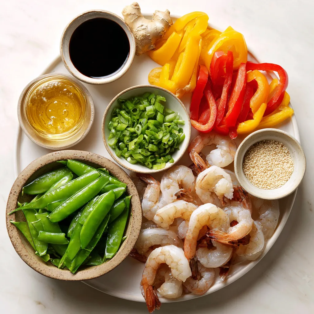 Gather these ingredients before you start cooking. Fresh shrimp really enhance the dish’s flavor. The honey gives it a sweet touch, while garlic and ginger add depth. You can use any color bell pepper you like, making this meal colorful and fun. The snap peas add a nice crunch.