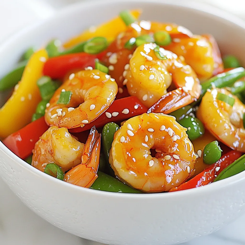 To make a tasty Honey Garlic Shrimp Stir Fry, you will need the following fresh ingredients: - 1 pound large shrimp, peeled and deveined - 2 tablespoons honey - 3 cloves garlic, minced - 1 tablespoon soy sauce - 1 tablespoon sesame oil - 1 bell pepper, sliced (any color) - 1 cup snap peas, trimmed - 2 green onions, chopped - 1 tablespoon ginger, minced - 1 tablespoon cornstarch - 2 tablespoons vegetable oil - Salt and pepper to taste - Sesame seeds for garnish Gather these ingredients before you start cooking. Fresh shrimp really enhance the dish’s flavor. The honey gives it a sweet touch, while garlic and ginger add depth. You can use any color bell pepper you like, making this meal colorful and fun. The snap peas add a nice crunch. This list is simple, but it packs a punch of flavor. Each ingredient plays a key role in creating a delightful meal that is quick to make. {{ingredient_image_1}} - Whisk together the honey, soy sauce, garlic, ginger, and cornstarch. - Heat vegetable oil in a skillet or wok over medium-high heat. In this step, mixing the honey, soy sauce, garlic, ginger, and cornstarch creates a thick sauce. This blend adds a sweet and savory flavor to the shrimp. The cornstarch helps the sauce stick to the shrimp and veggies. Heat your skillet or wok until it’s hot. This ensures a good sear on the shrimp and veggies. - Season and cook shrimp until pink and opaque. - Set shrimp aside after cooking. Add the shrimp to the hot oil. Season them lightly with salt and pepper. Cook for about 2-3 minutes. Watch closely as they turn pink and opaque. This means they are done. Once cooked, take the shrimp out and set them aside. This keeps them tender. - Add bell pepper and snap peas. - Cook until vegetables start to soften. In the same skillet, toss in the sliced bell pepper and snap peas. Stir-fry these for about 2-3 minutes. You want them to be bright and slightly soft, but still crunchy. This helps keep the meal fresh and colorful. - Return shrimp to skillet with vegetables. - Pour honey garlic sauce over everything and cook until thickened. Now, add the shrimp back to the skillet. Pour the honey garlic sauce over the shrimp and veggies. Toss everything together to coat well. Cook for an additional 2-3 minutes. This allows the sauce to thicken and all the flavors to meld. - Use fresh shrimp for optimal taste. Fresh shrimp adds a sweet, briny flavor. - Adjust honey and soy sauce to your preferred sweetness. You can add more honey for sweetness or soy sauce for saltiness. - High heat is key for stir-frying. It helps cook the shrimp quickly and evenly. - Quick cooking keeps veggies crunchy. This adds a nice texture to your dish. - Top with chopped green onions for a fresh pop. This adds color and flavor. - Use sesame seeds to make your dish look fancy. They add a nice crunch and nutty taste. - Feel free to change garnishes based on your taste. Try cilantro or lime for a fresh twist. Pro Tips Fresh Shrimp is Best: Always opt for fresh shrimp if available, as they offer superior flavor and texture compared to frozen options. Customize Your Veggies: Feel free to add other vegetables like broccoli or carrots for added nutrition and color in your stir fry. Thicken the Sauce: If you prefer a thicker sauce, let it simmer longer after adding the honey garlic mixture to achieve your desired consistency. Serving Suggestions: Serve over rice or noodles to make it a complete meal, and don't forget to drizzle extra sauce on top! {{image_2}} You can easily swap shrimp for chicken or tofu. Chicken adds heartiness and works great with the sauce. Tofu offers a plant-based option that absorbs flavors well. Other seafood options include scallops or fish for variety. Add more veggies like broccoli or carrots for color and crunch. Seasonal vegetables, like bell peppers in summer, offer fresh tastes. Try zucchini or snap peas for a different texture. Mixing in leafy greens like spinach can boost nutrition too. If you love heat, add chili flakes or fresh chilies. You can drizzle sriracha for a tangy kick. Consider using spicy soy sauce for added flavor. Experiment with different sauces, like teriyaki or hoisin, for fun. To store leftovers, place honey garlic shrimp stir fry in an airtight container. Keep it in the refrigerator. It will stay fresh for up to three days. Before you eat it again, check for any off smells. When reheating, use a skillet for even heat. Add a splash of water to keep it moist. Heat it on medium until warm. Yes, you can freeze honey garlic shrimp stir fry. It tastes great even after freezing. Use a freezer-safe bag or container to store it. Remove as much air as you can to prevent freezer burn. It can last up to three months in the freezer. When you want to eat it, move the container to the fridge overnight. This will help it thaw slowly. If you're in a hurry, you can defrost it in the microwave. Once thawed, reheat it in a skillet for the best taste. You can pair this dish with several tasty sides. Here are some great options: - Steamed rice or jasmine rice - Fried rice for extra flavor - Noodles, such as chow mein or rice noodles - A fresh green salad for crunch - Sautéed bok choy or broccoli for veggies These sides balance the sweet and savory taste of the shrimp stir fry. They add different textures and flavors to your meal. Yes, you can prep this dish in advance. Here’s how: - Chop your vegetables and store them in the fridge. - You can also mix the sauce ahead of time. - Cook the shrimp fresh to keep them tender. If you want, you can cook and store the whole dish. Just keep it in an airtight container in the fridge for up to three days. To thicken the sauce, you can use a few easy methods: - Add more cornstarch. Mix it with a little water before adding. - Cook the sauce longer to reduce it. This will make it thicker. - Try adding a tiny bit of flour if you don’t have cornstarch. These tips will help you achieve the perfect sauce consistency. Yes, this recipe is great fo