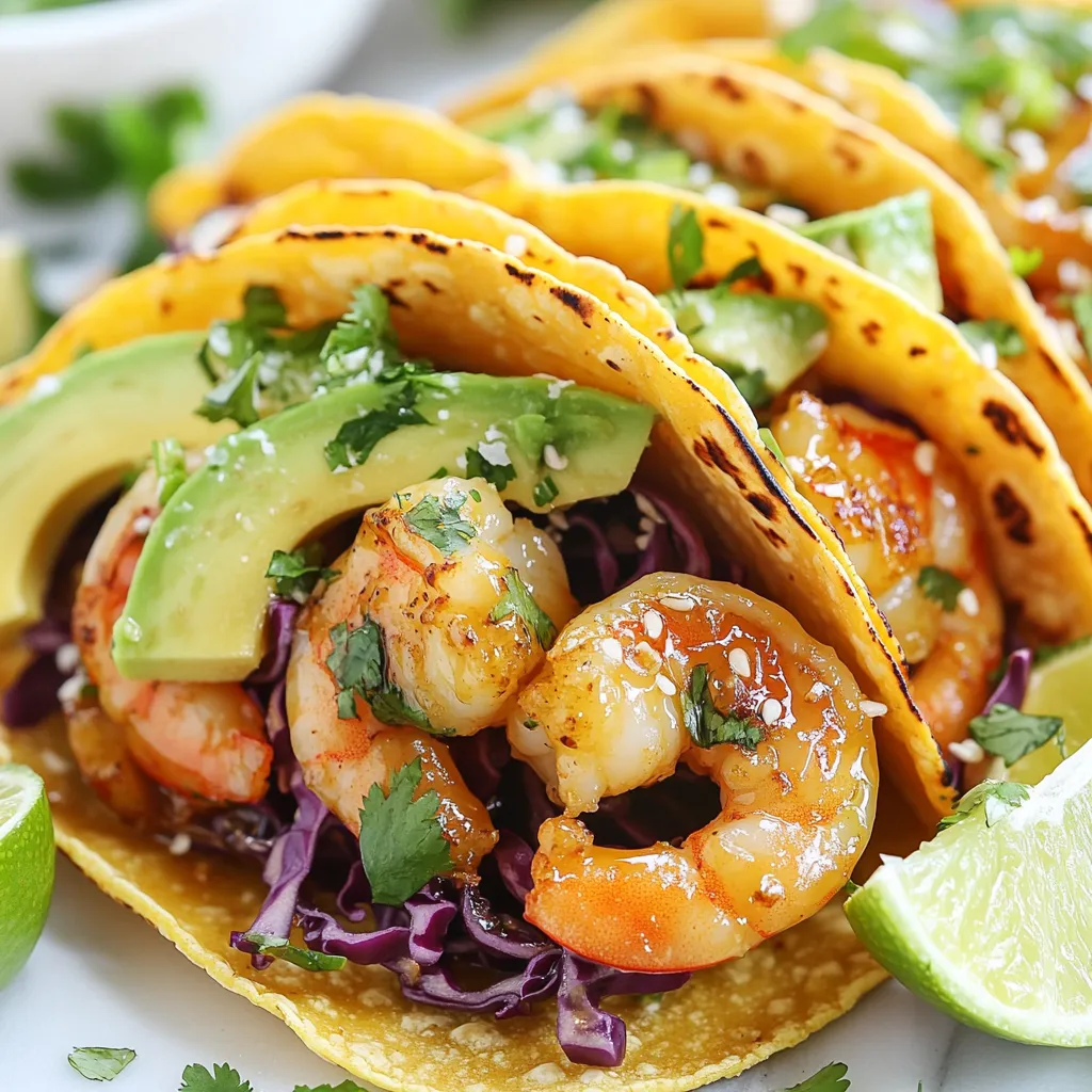 Delicious shrimp tacos with a sweet and savory honey garlic marinade, topped with fresh avocado and cabbage.