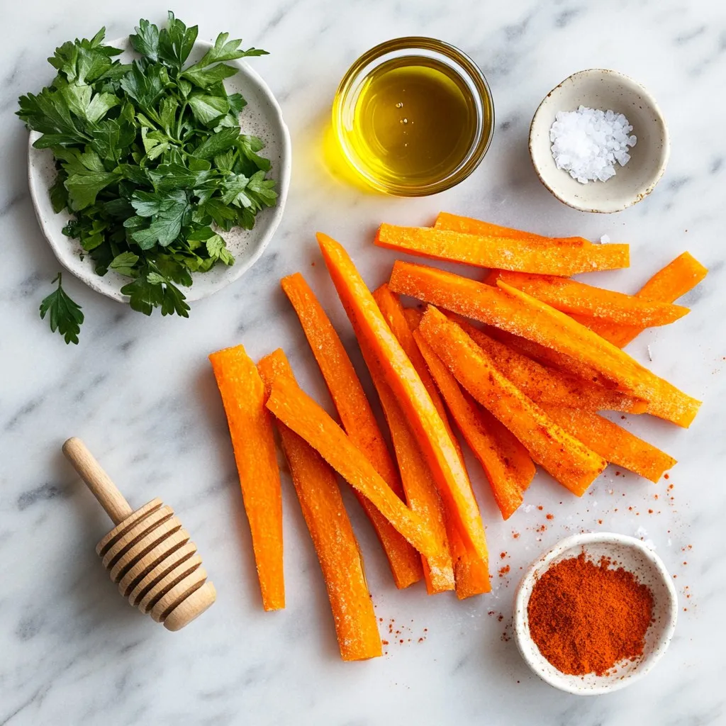 The main ingredients are simple and fresh. I love using large carrots because they make great fries. Honey adds a sweet touch, while olive oil helps everything cook nicely.