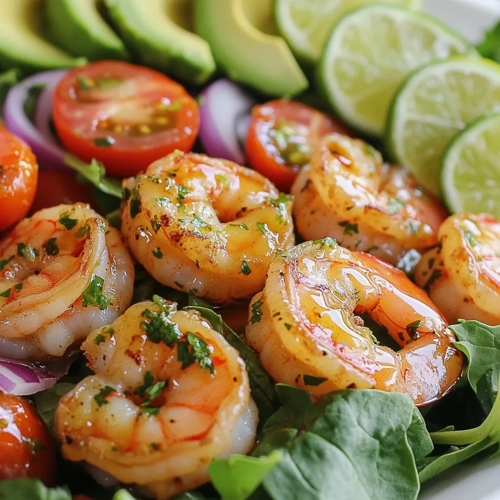 While the shrimp marinate, I prepare the salad base. I take a large serving bowl and add the mixed leafy greens. I choose spinach, arugula, and romaine for a nice mix. Then, I add sliced avocado, halved cherry tomatoes, thinly sliced red onion, and chopped cilantro. I toss everything together gently. This way, all the flavors mix evenly and look colorful.