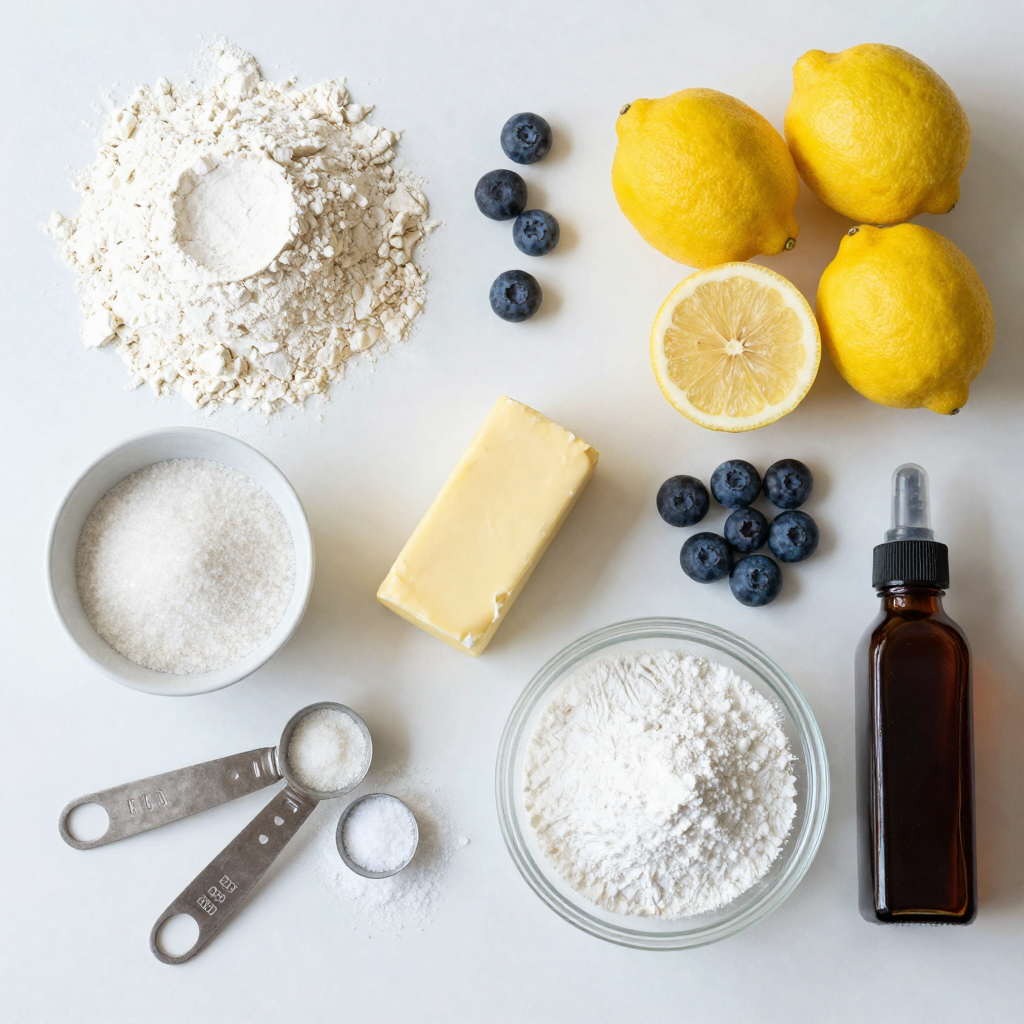 To create a Lemon Blueberry Pound Cake, you need some simple ingredients. The base combines flour, sugar, and butter for a rich texture. The eggs add moisture and help the cake rise.