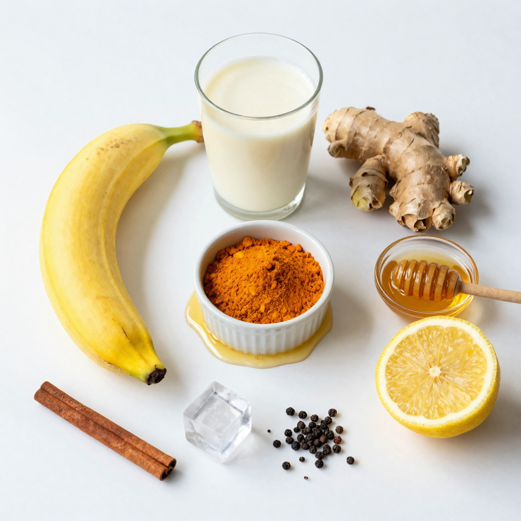 - In a blender, combine the frozen banana, almond milk, grated ginger, ground turmeric, honey, lemon juice, cinnamon, and a pinch of black pepper.