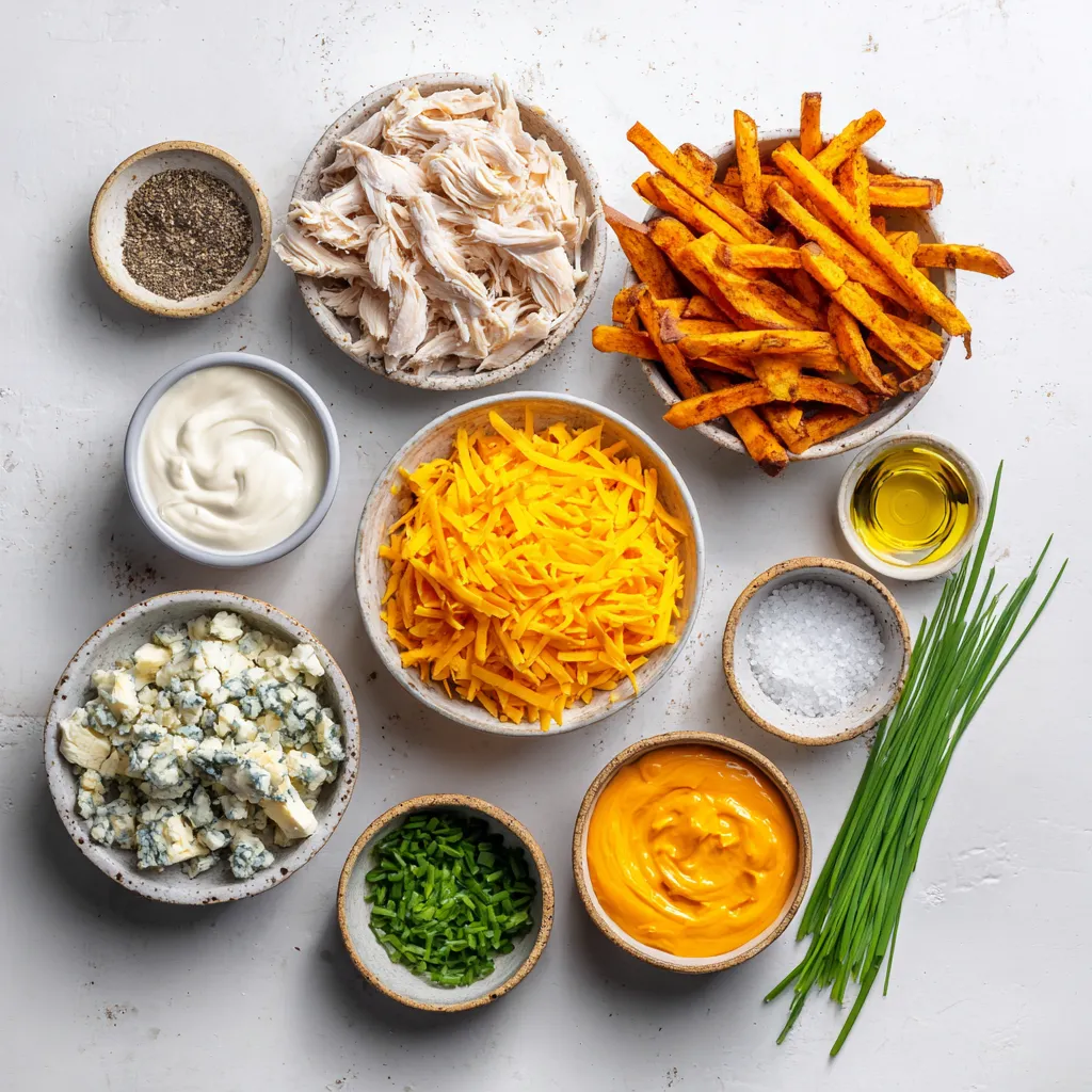 To make Loaded Buffalo Chicken Fries, you need fresh, simple ingredients. First, choose 4 medium-sized russet potatoes. They fry up perfectly crisp. Next, grab 2 cups of cooked shredded chicken. This can be leftover rotisserie chicken or poached chicken.