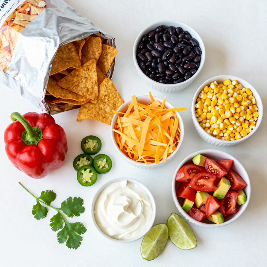 Start by preheating your oven to 375°F (190°C). This step is key to getting crispy nachos. Next, take a large baking sheet and spread out the tortilla chips. Aim for an even layer so all chips get toppings. In a mixing bowl, combine black beans, corn, diced red bell pepper, sliced jalapeño, and diced tomatoes. Squeeze lime juice over the mix and add salt and pepper. This brightens the flavors.
