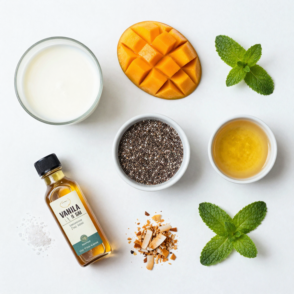 To begin, gather all your ingredients. You will need coconut milk, chia seeds, honey or maple syrup, vanilla extract, and salt. You can also prepare fresh mango, toasted coconut flakes, and mint for garnish. This part is simple and fun.
